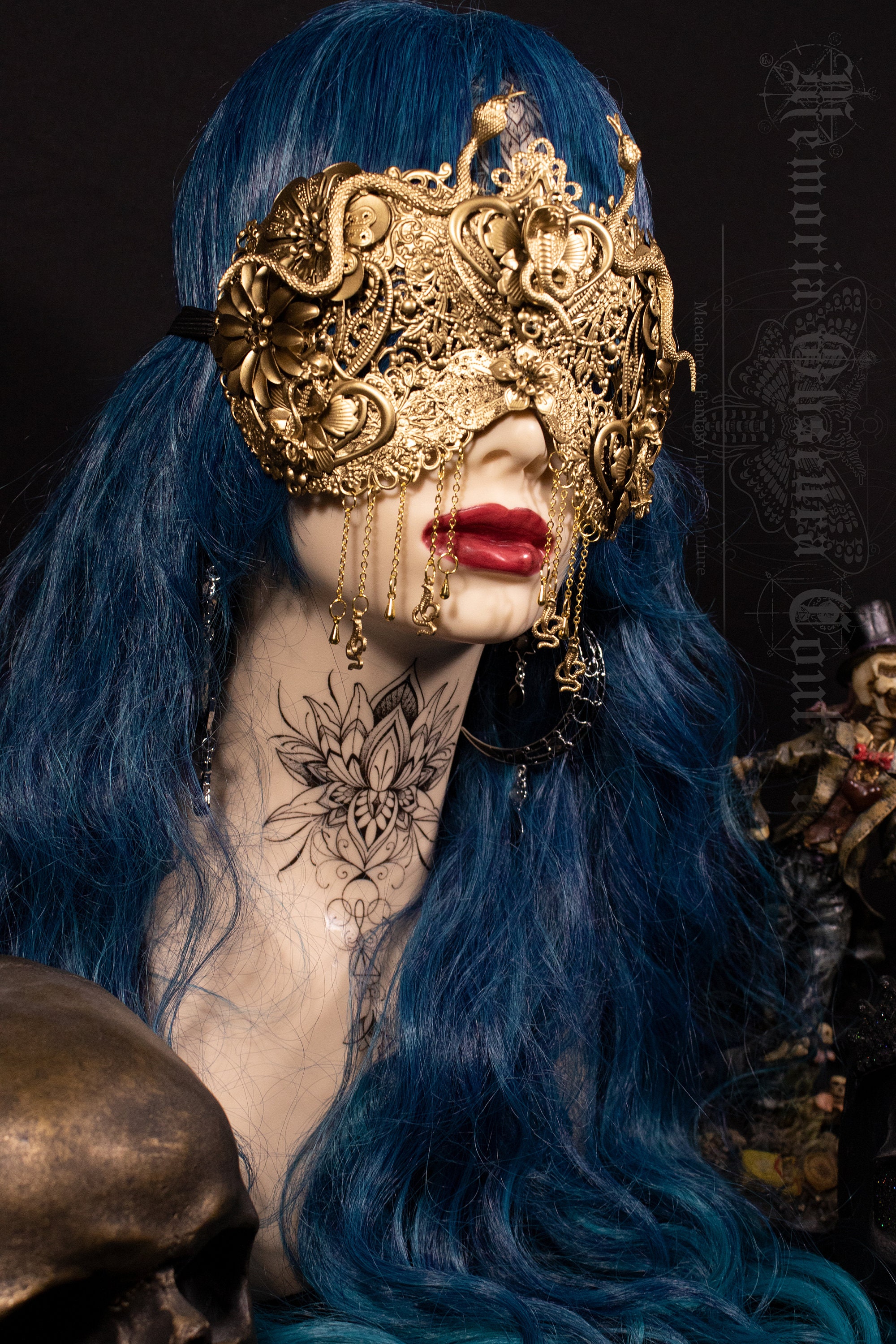 Blind optic mask decorated with filigree metal ornaments, chains and snakes that stretch around on it.