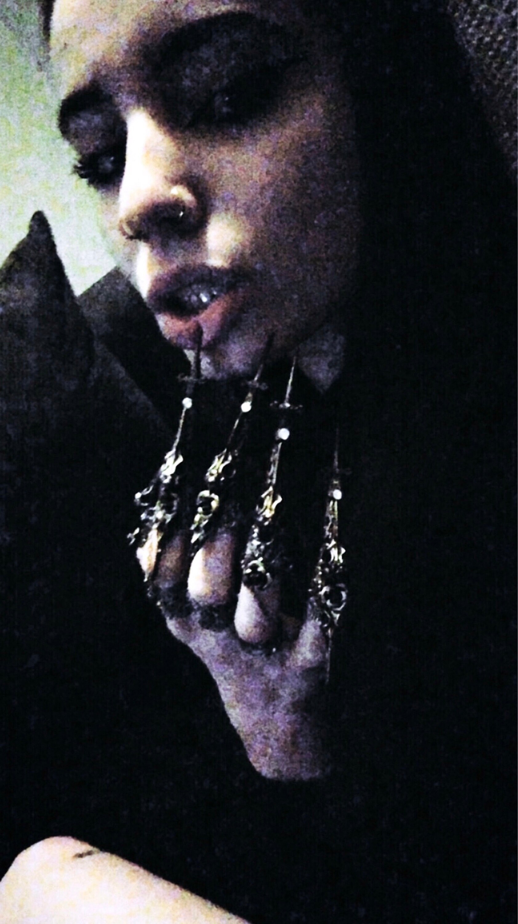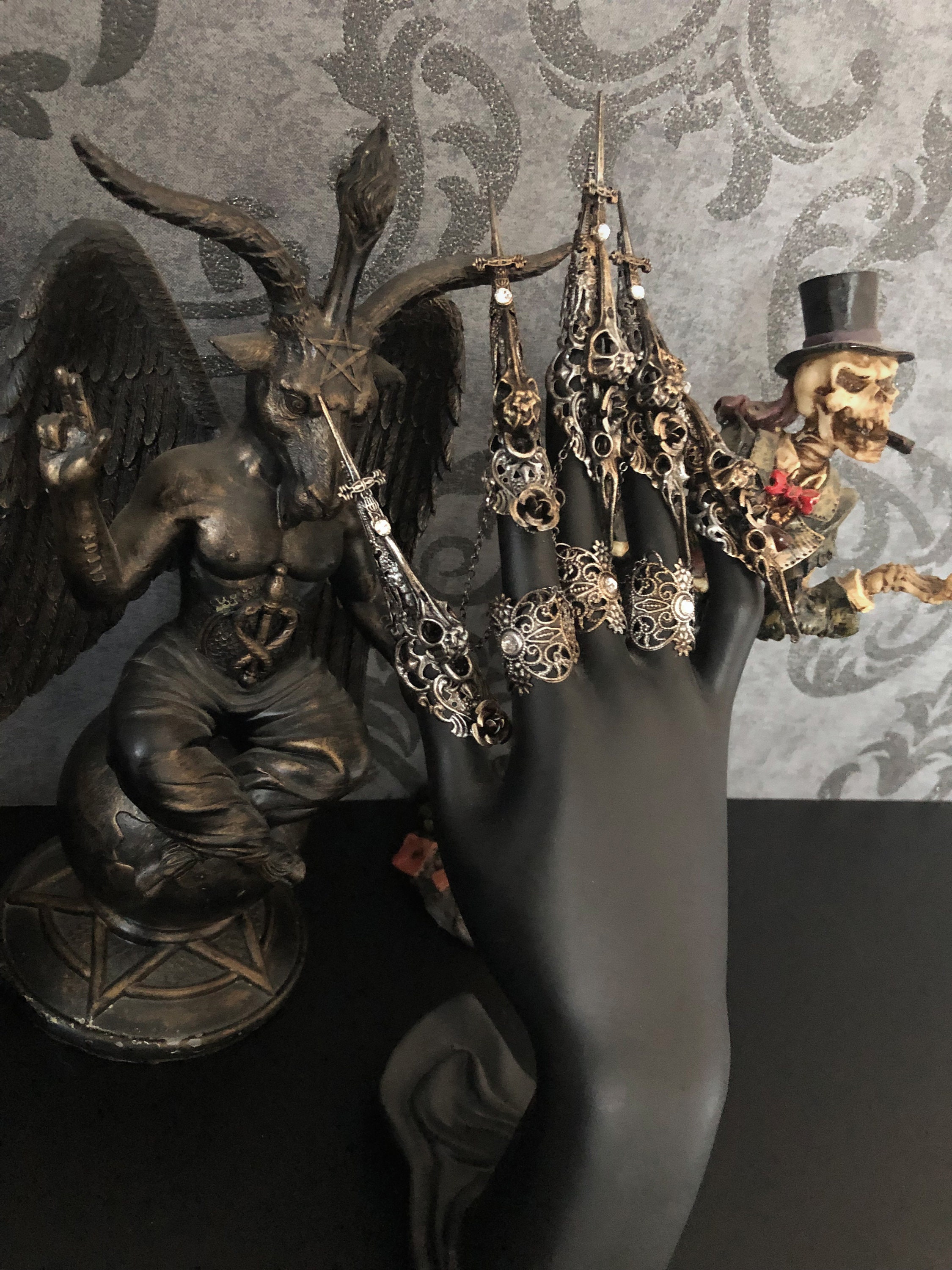 Metal finger claws and aluminum rings decorated with raven skulls, crosses, flowers and chains.