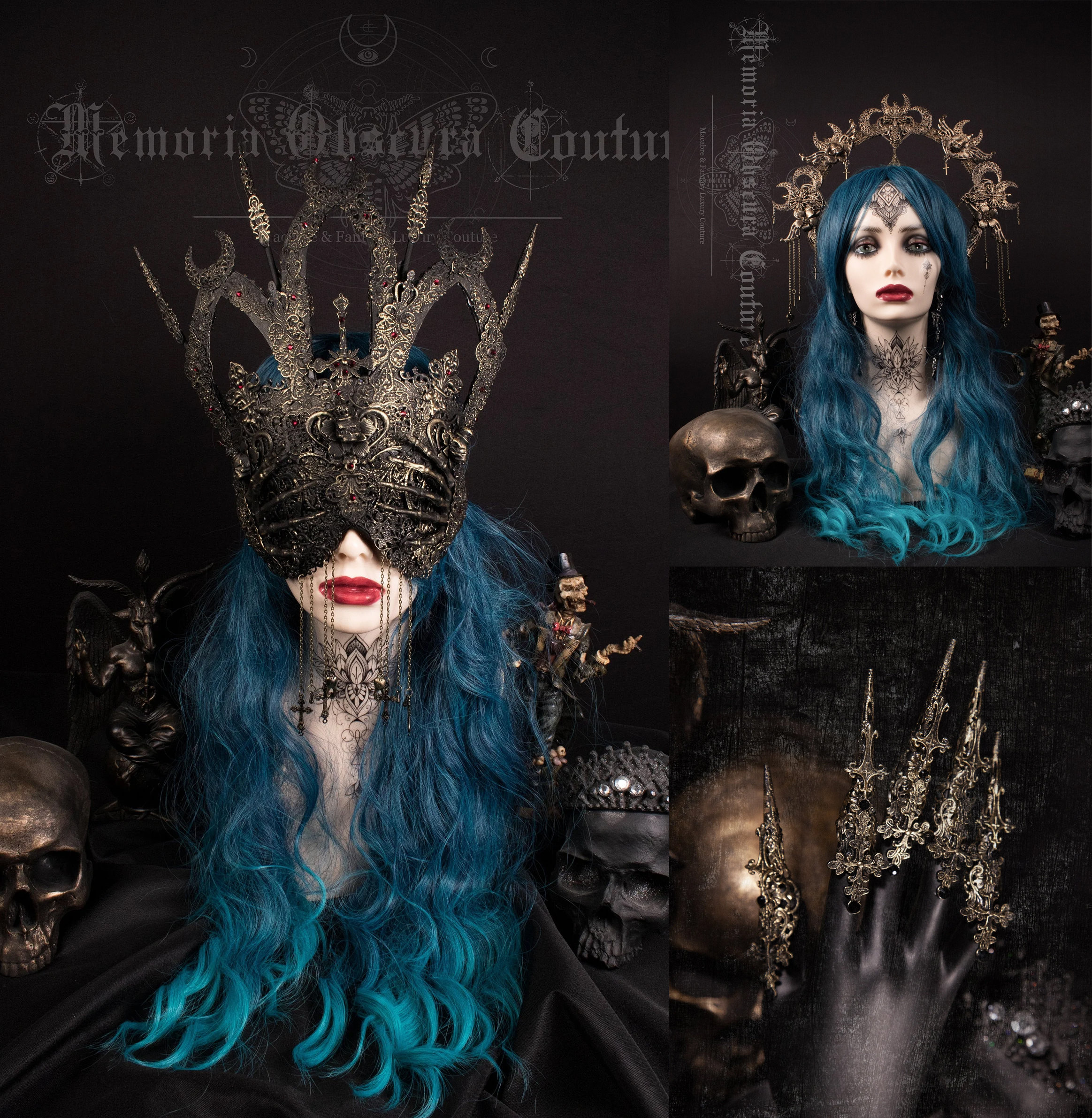 Set consisting of halo headdress, blind mask and metal finger claws for one hand.