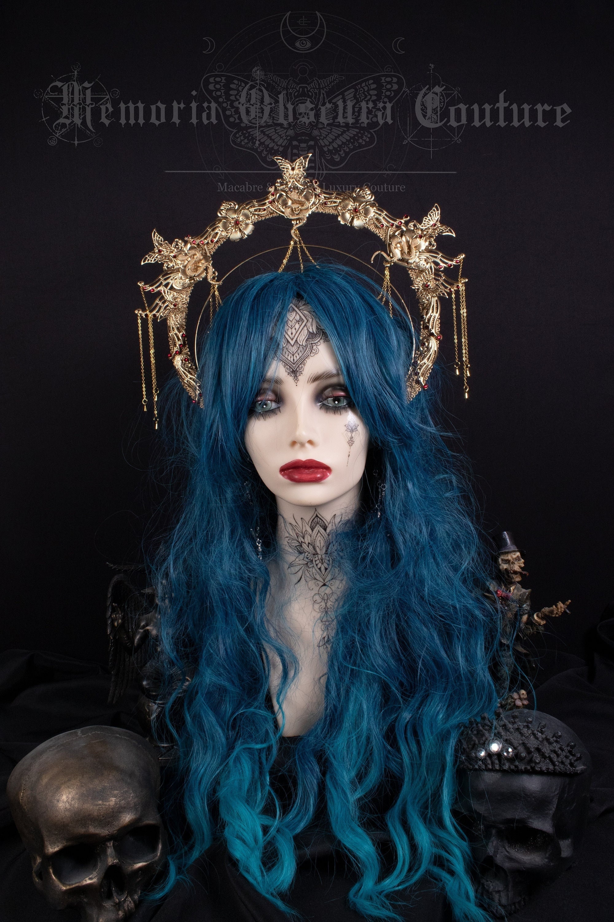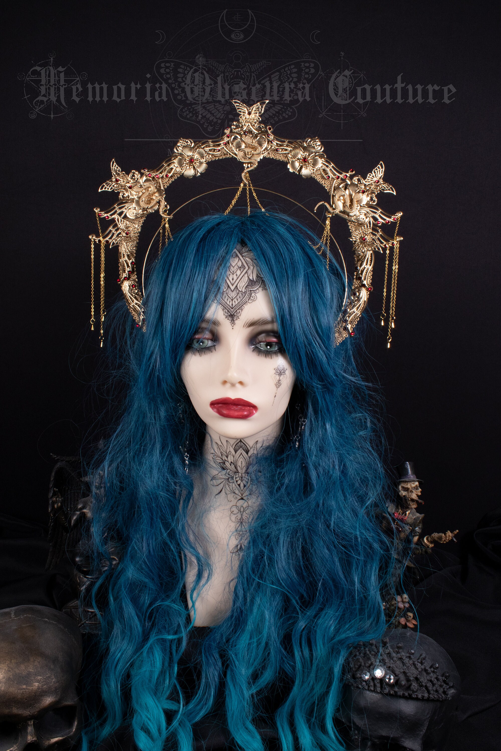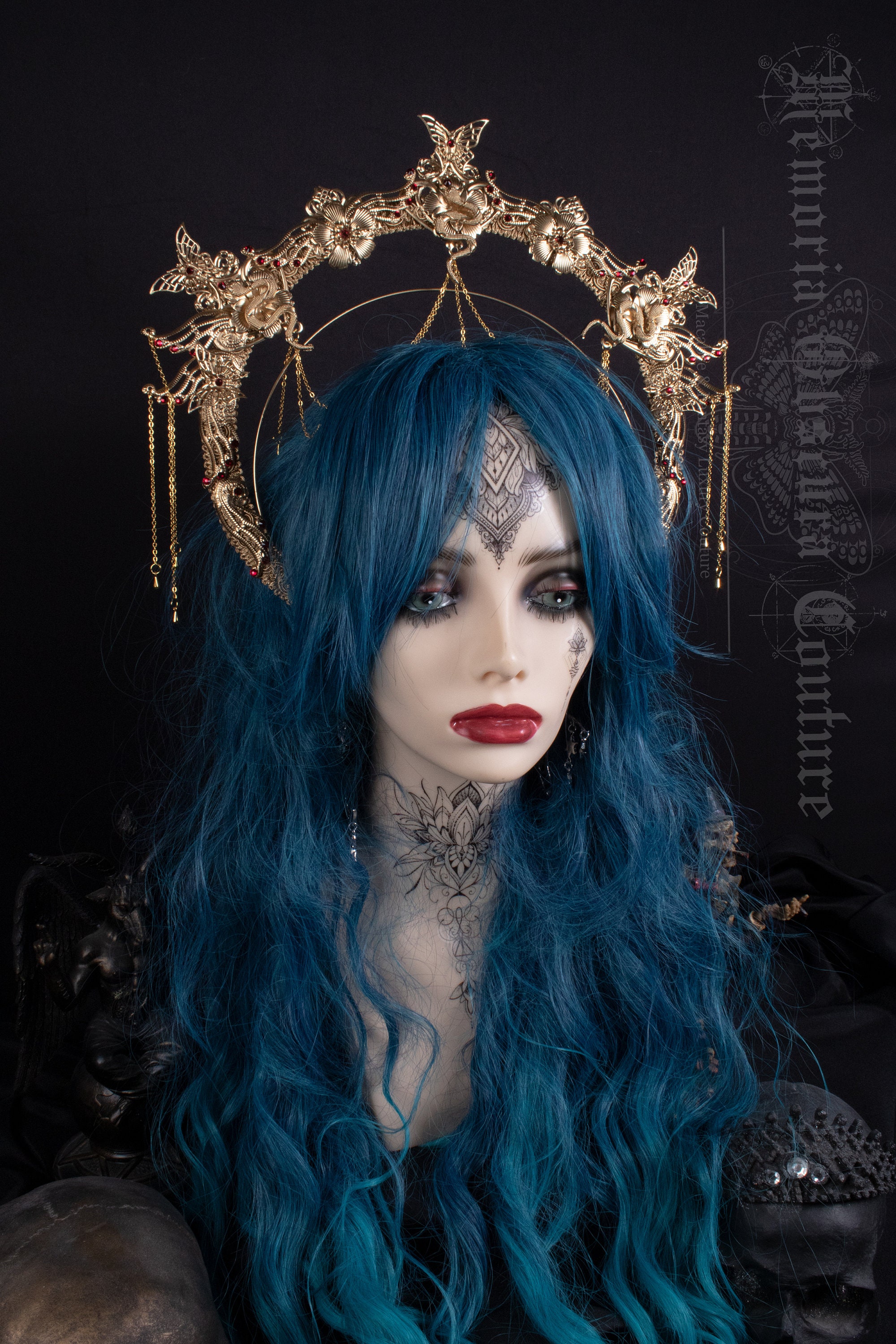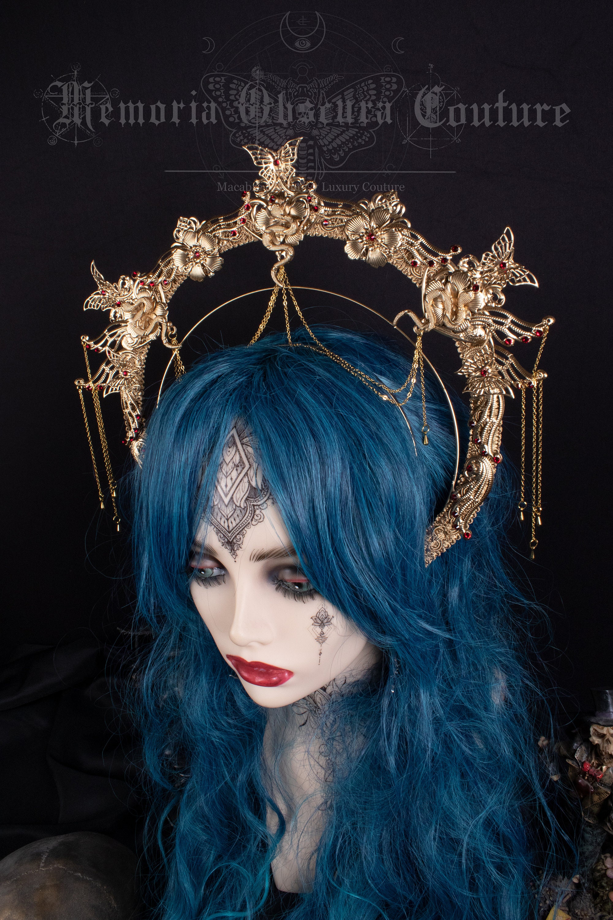 Halo headdress decorated with snakes, butterflies and filigree metal ornaments made of aluminum.