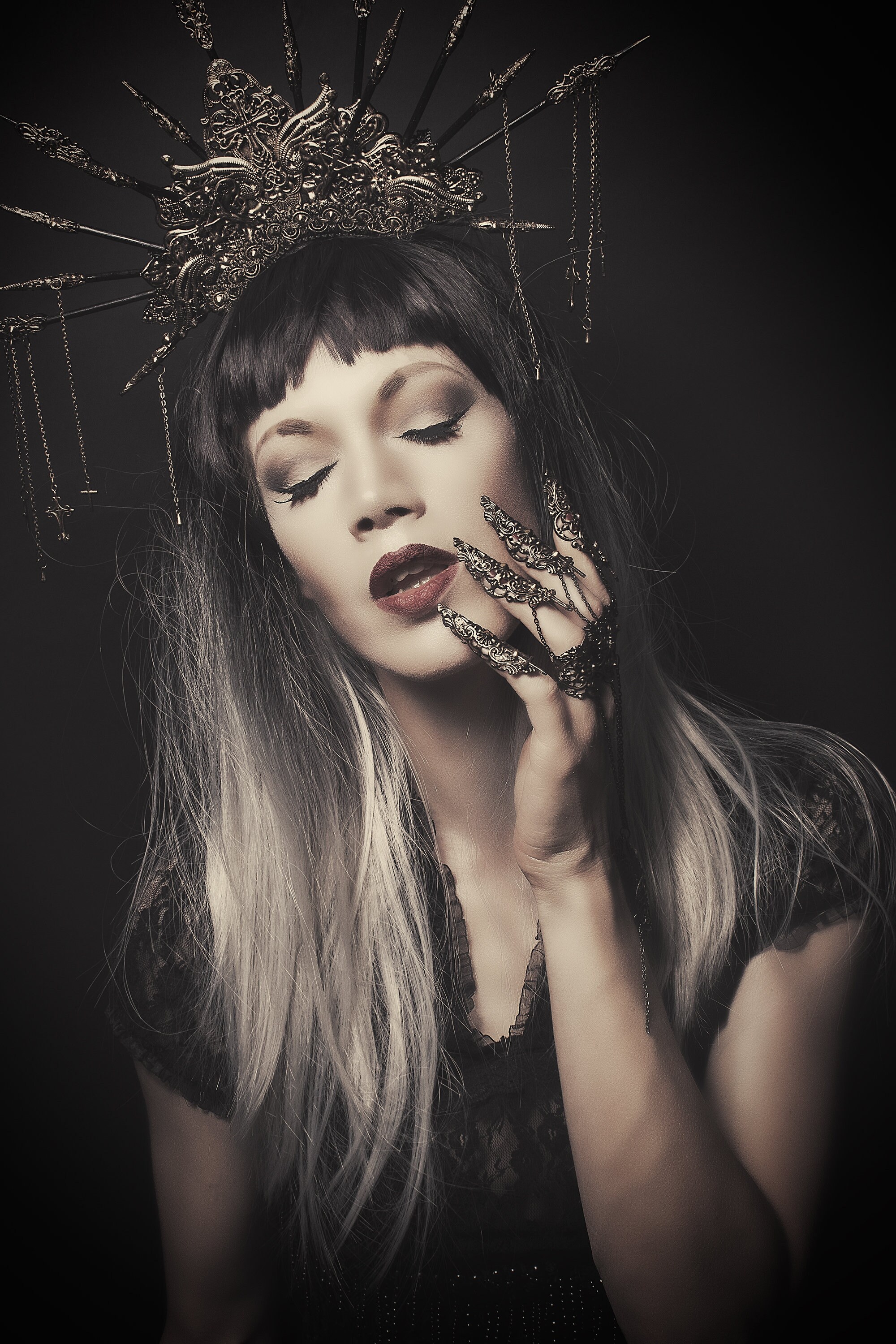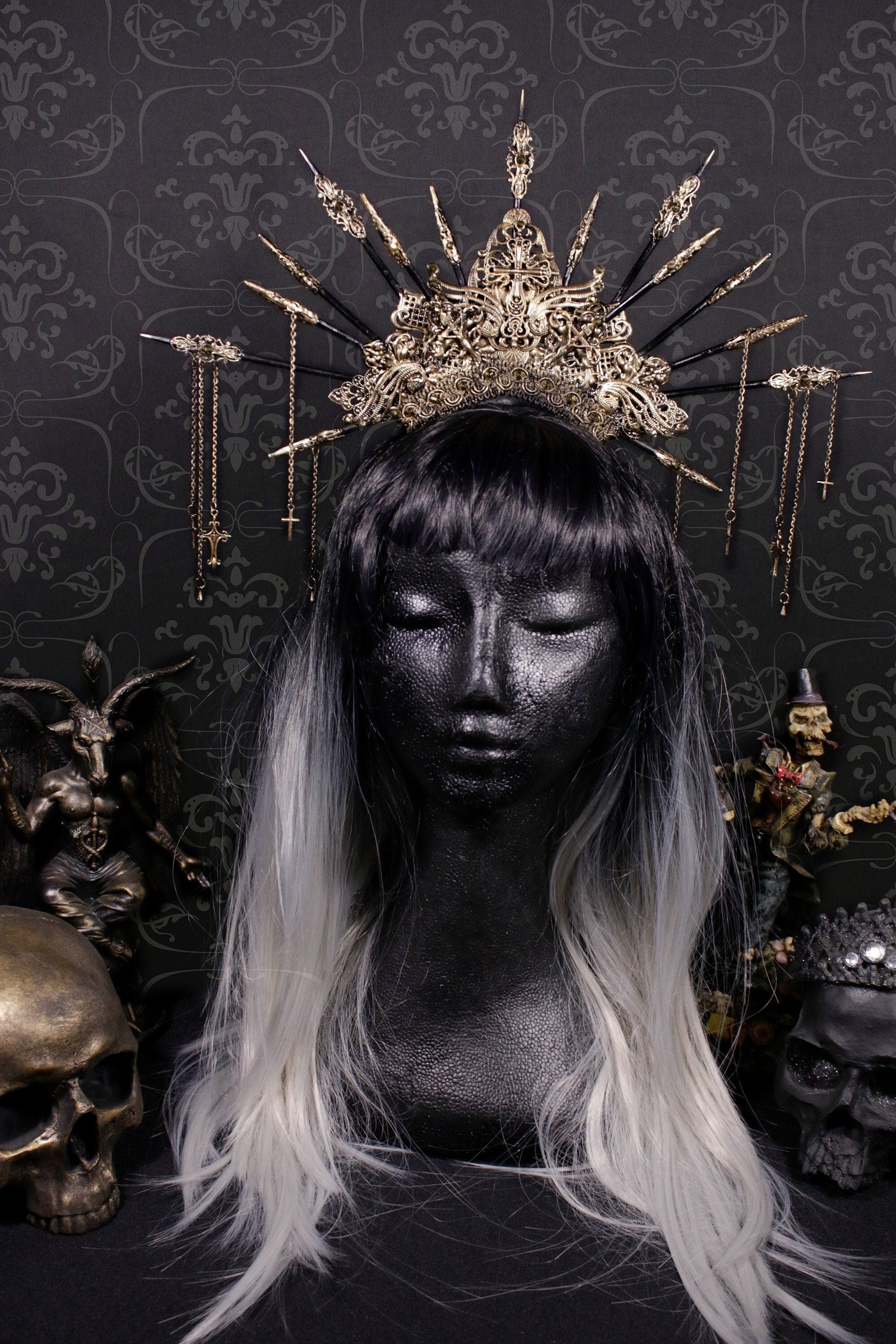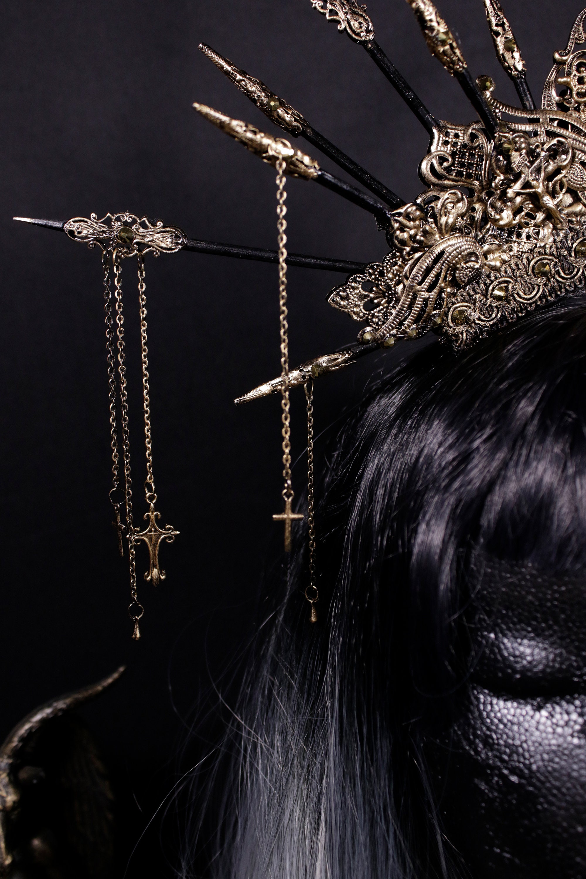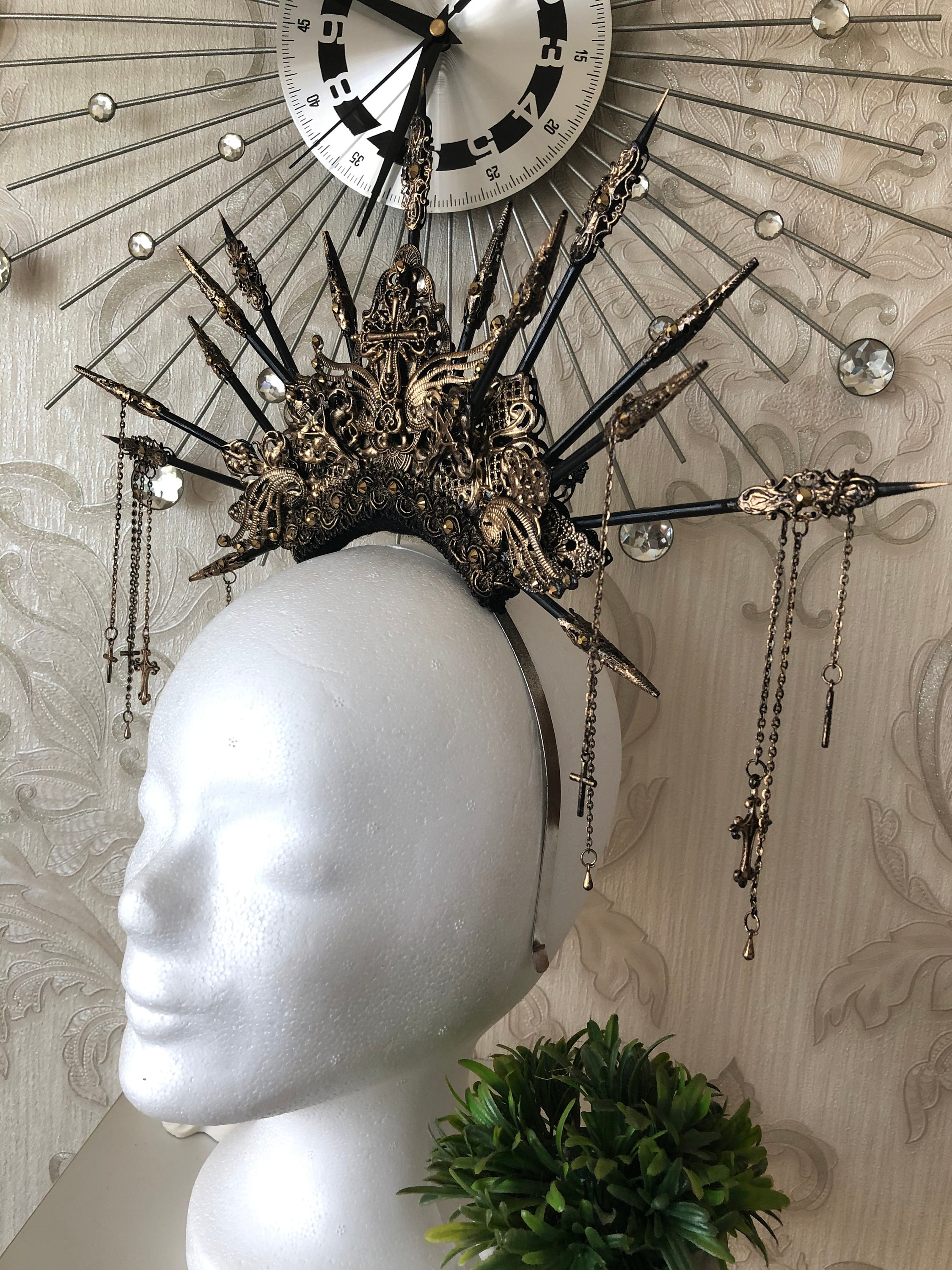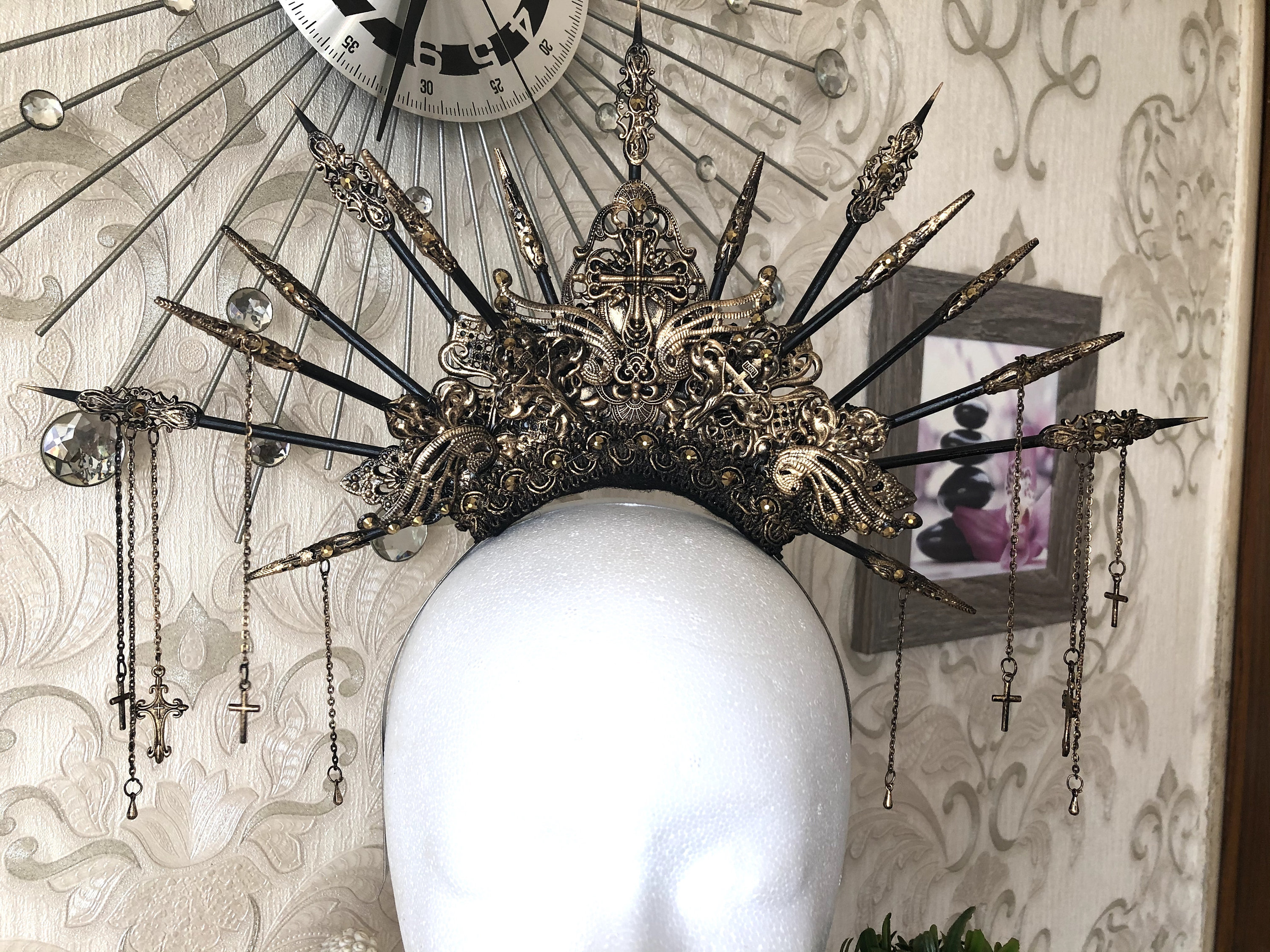 Headdress, crown decorated with filigree metal ornaments, chains and crosses. In our well-known 3D look thanks to protruding rods.