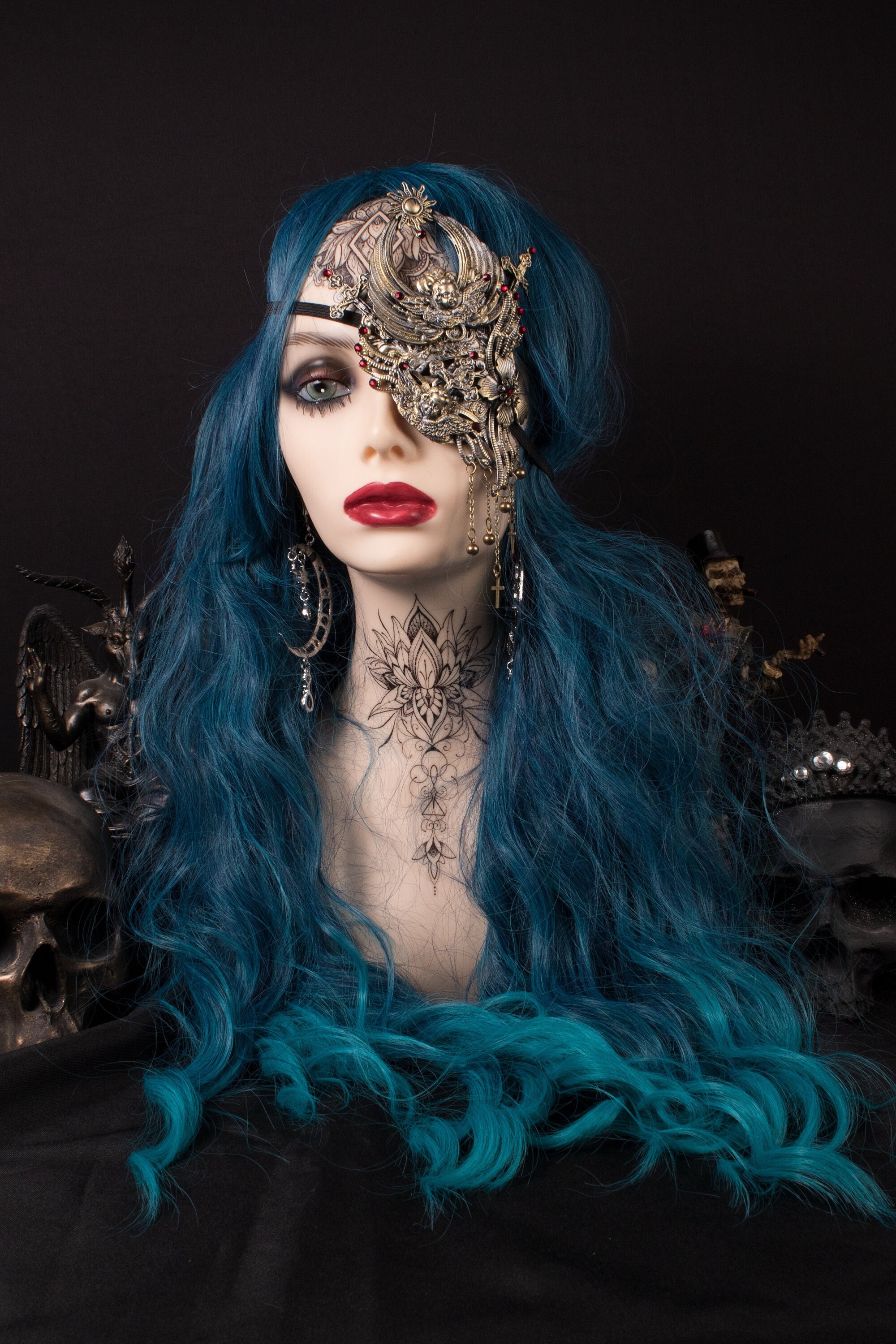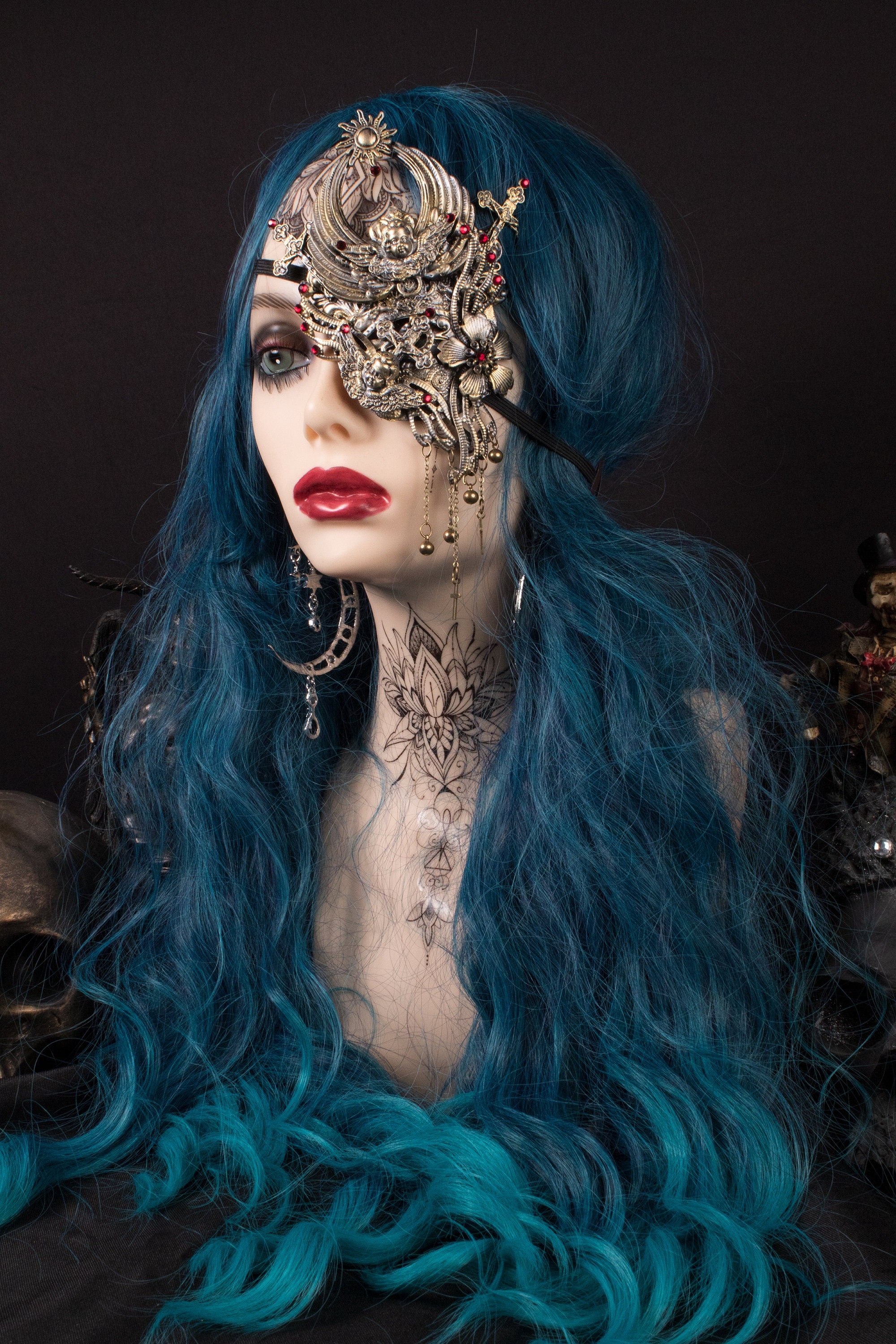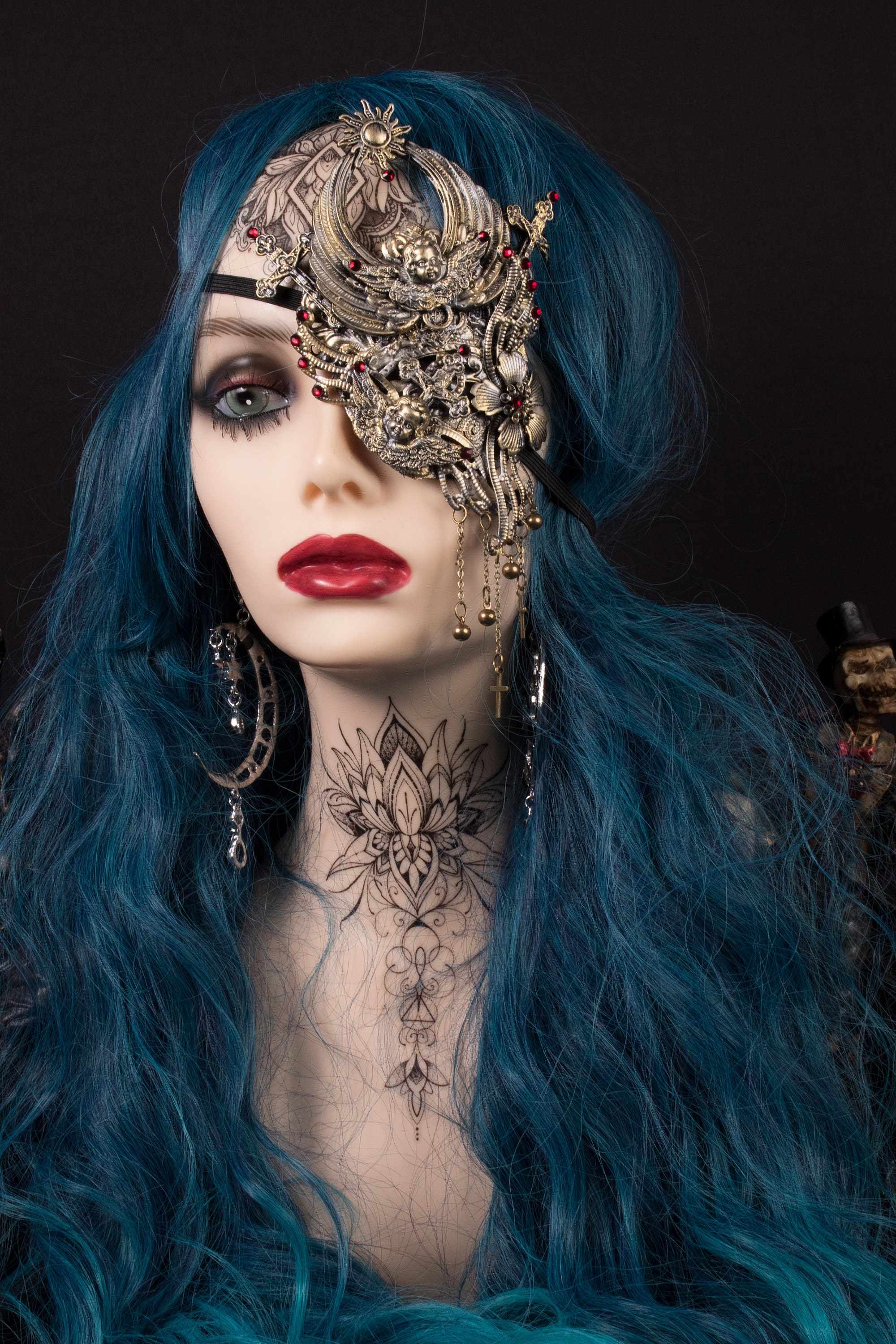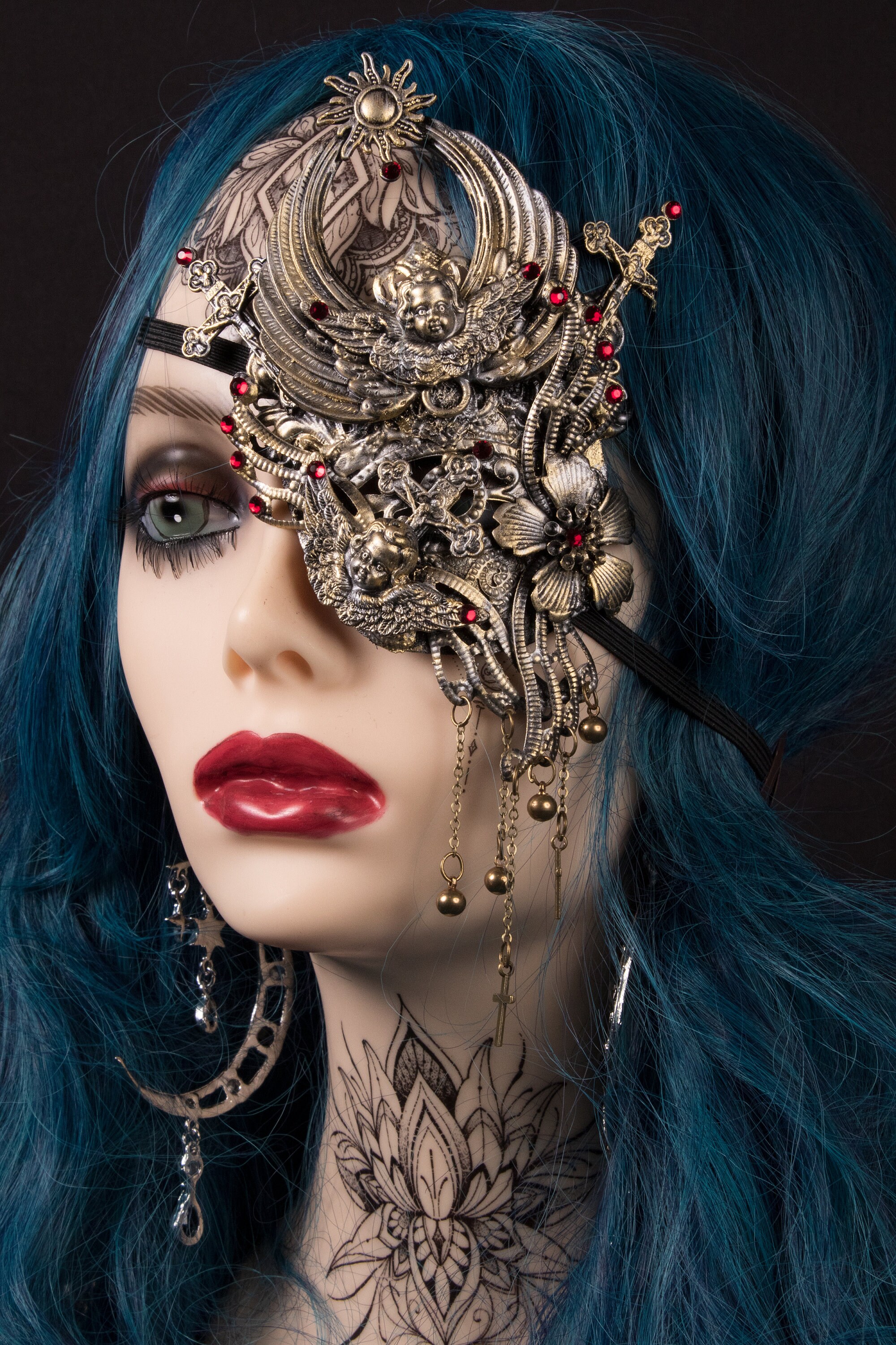 Blind mask eyepatch decorated with filigree metal ornaments, crosses and chains.