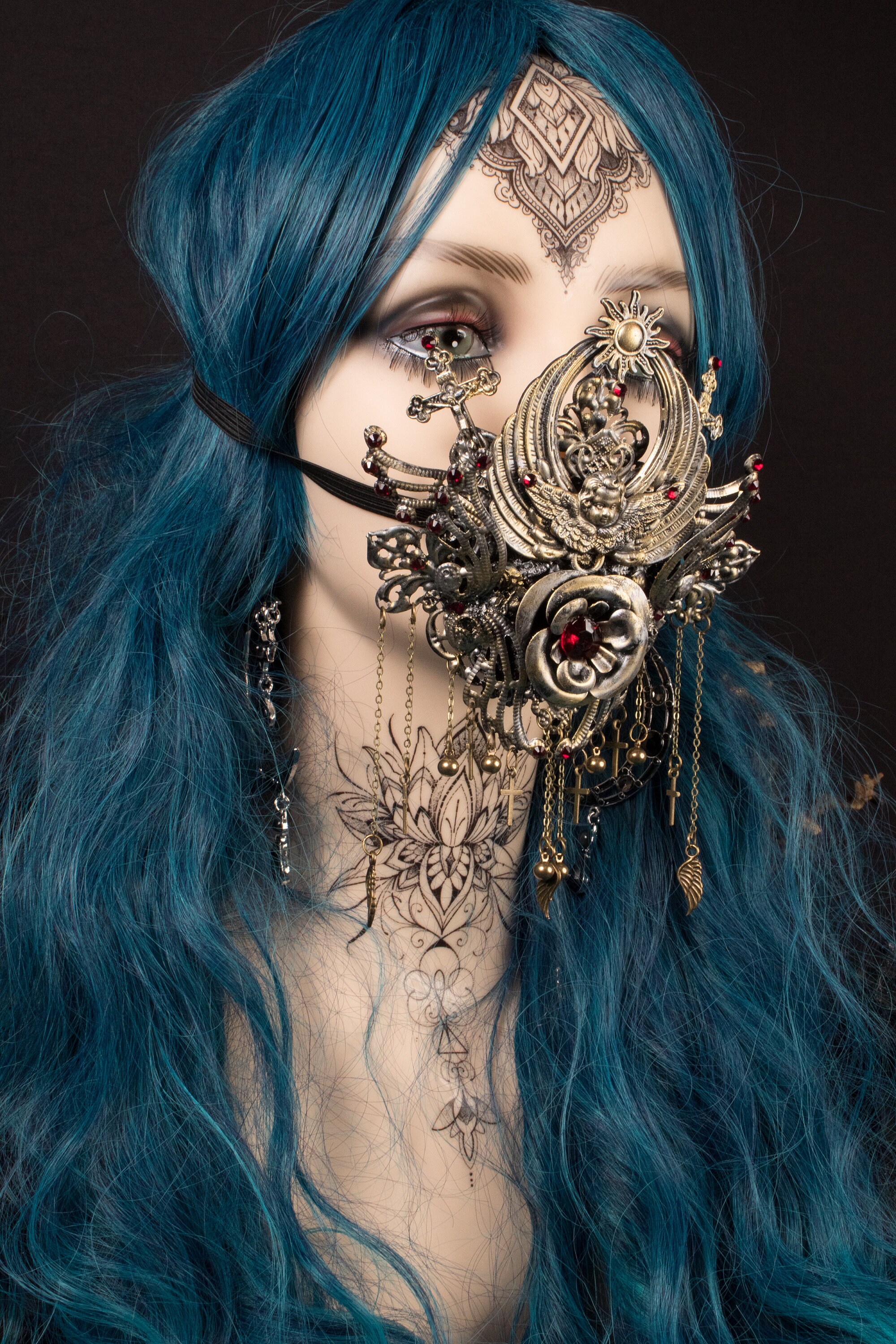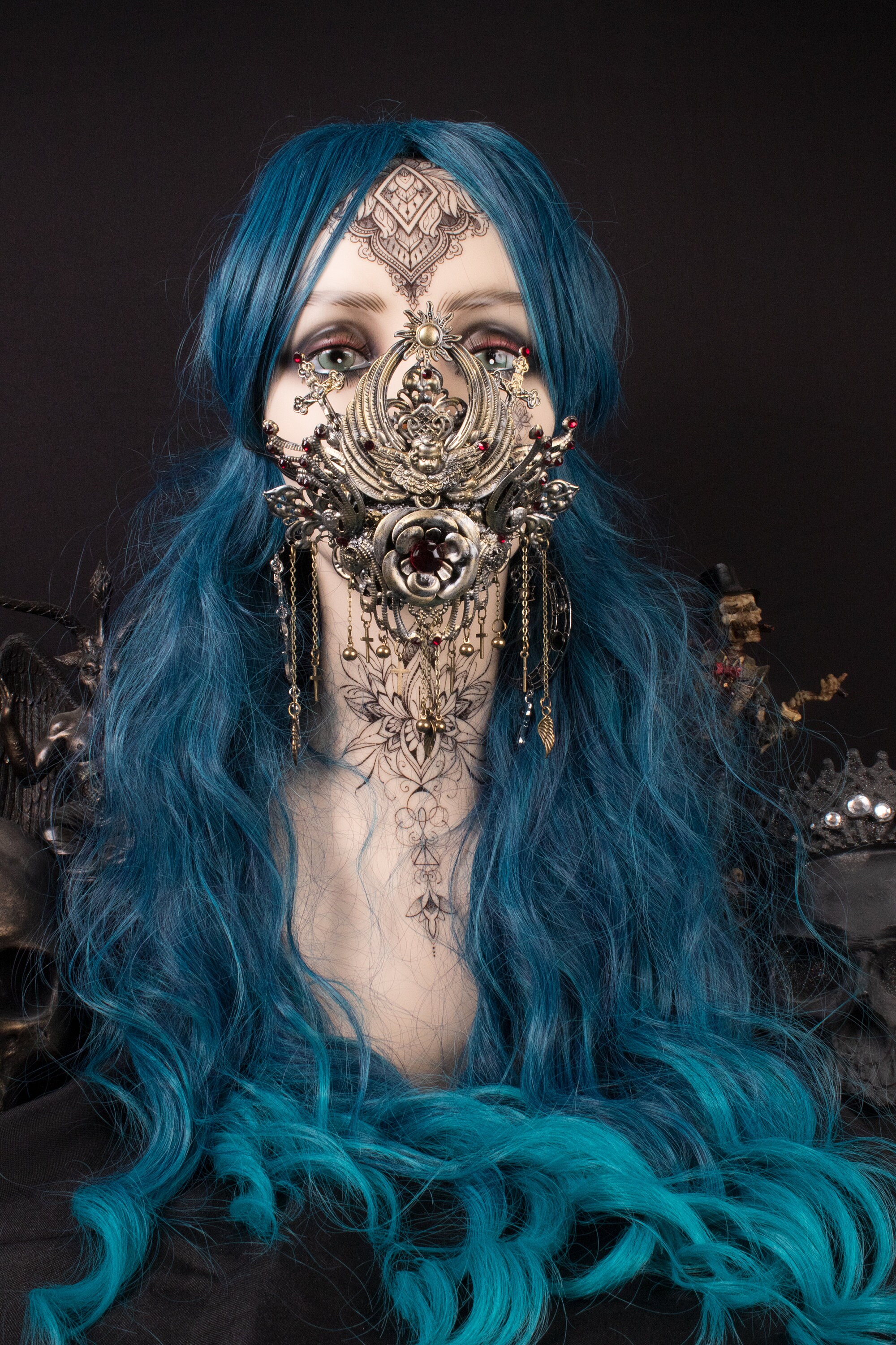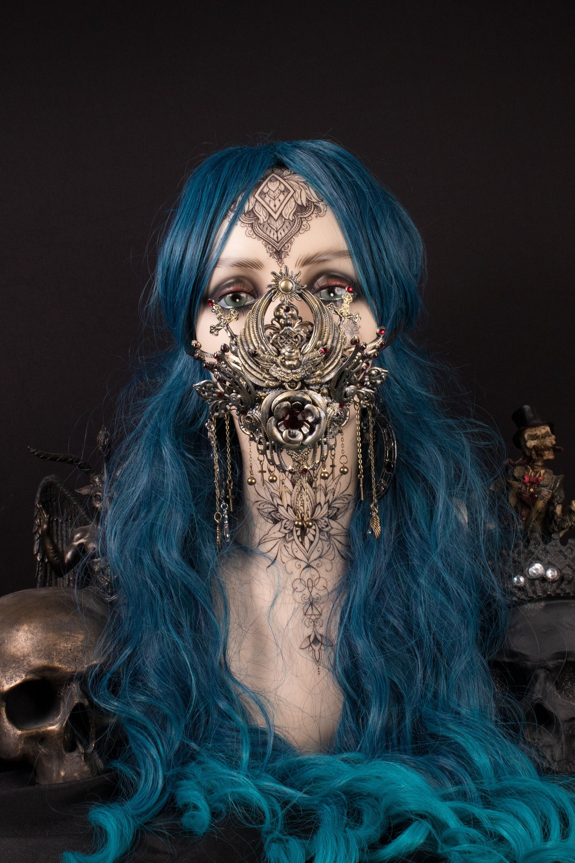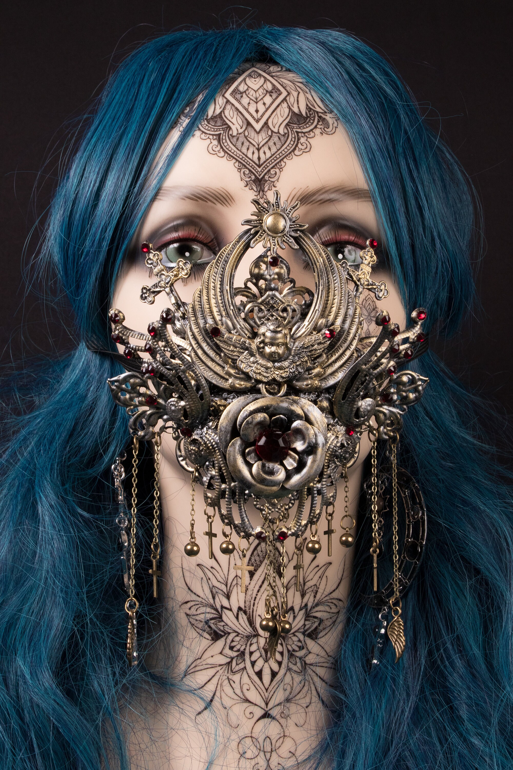 Handmade mouthpatch decorated with light metal ornaments, chains and crosses.