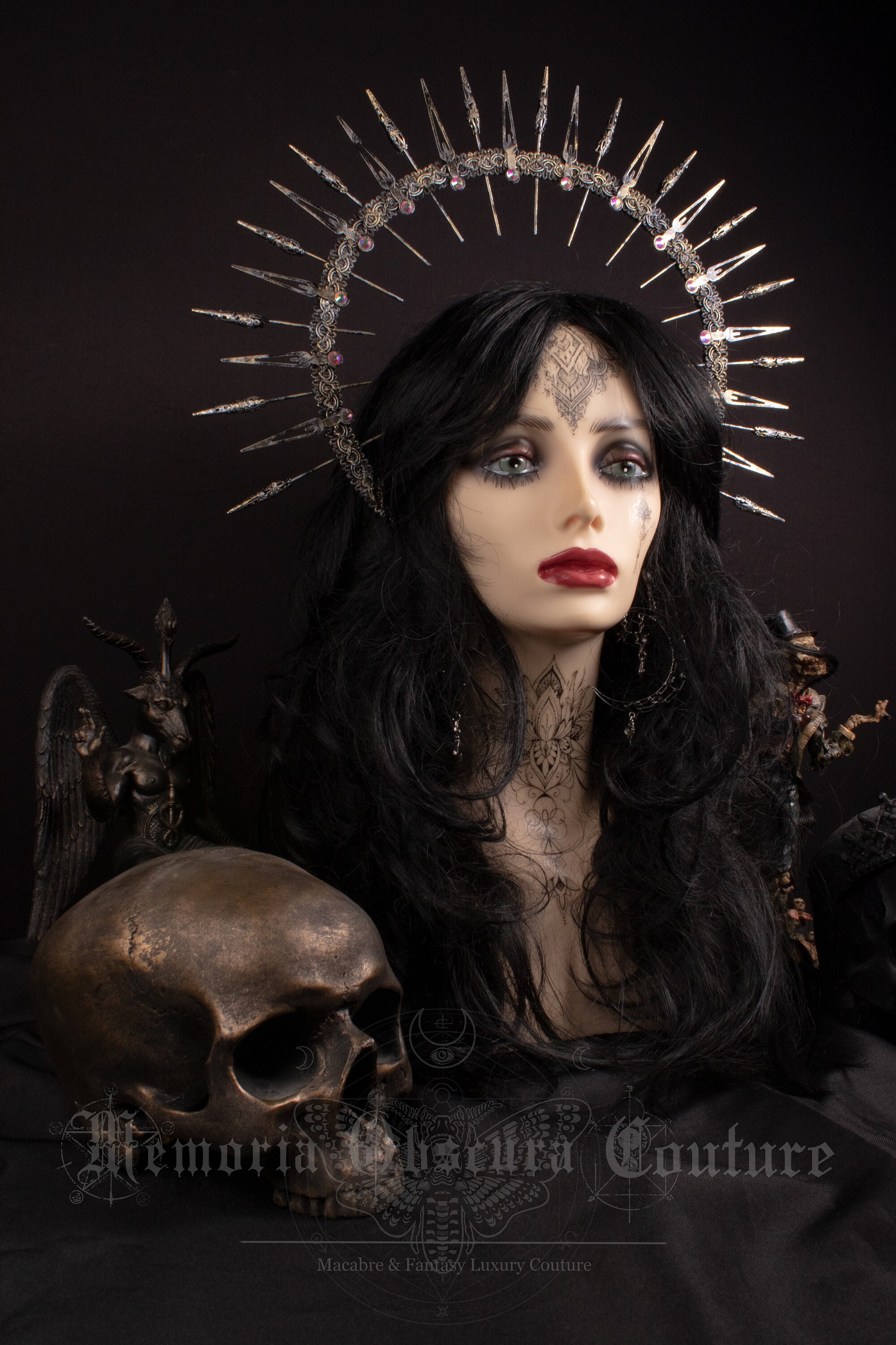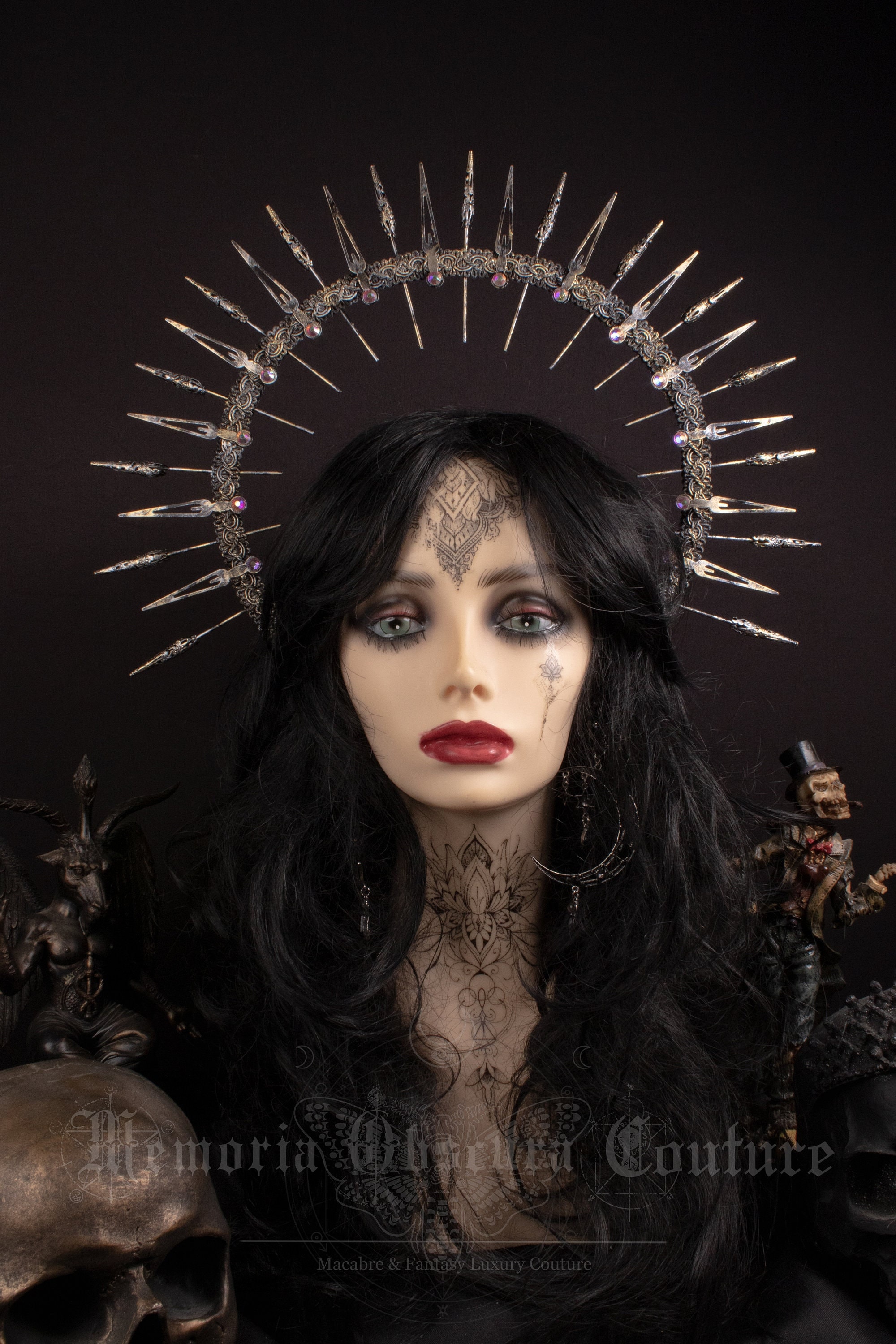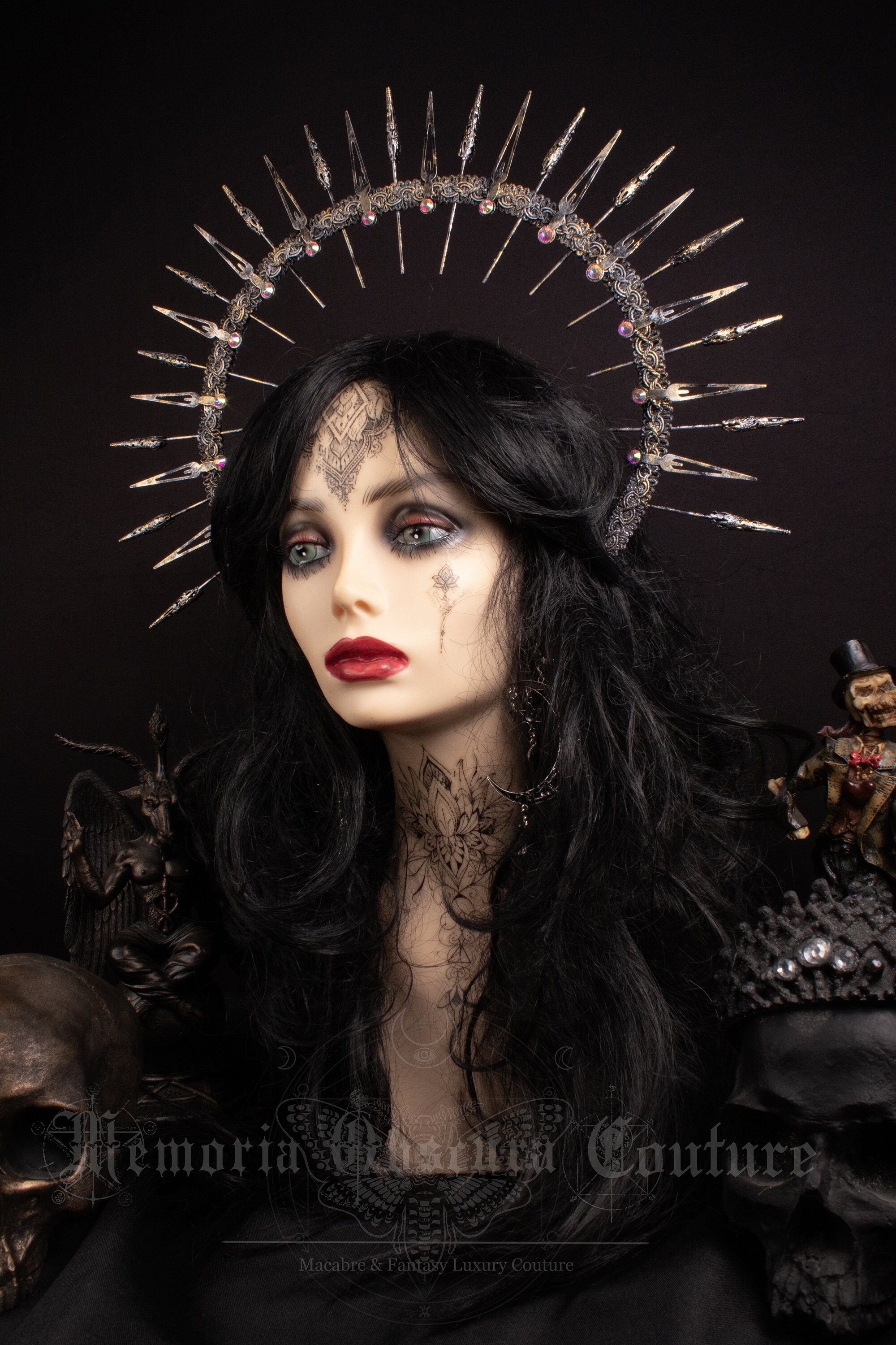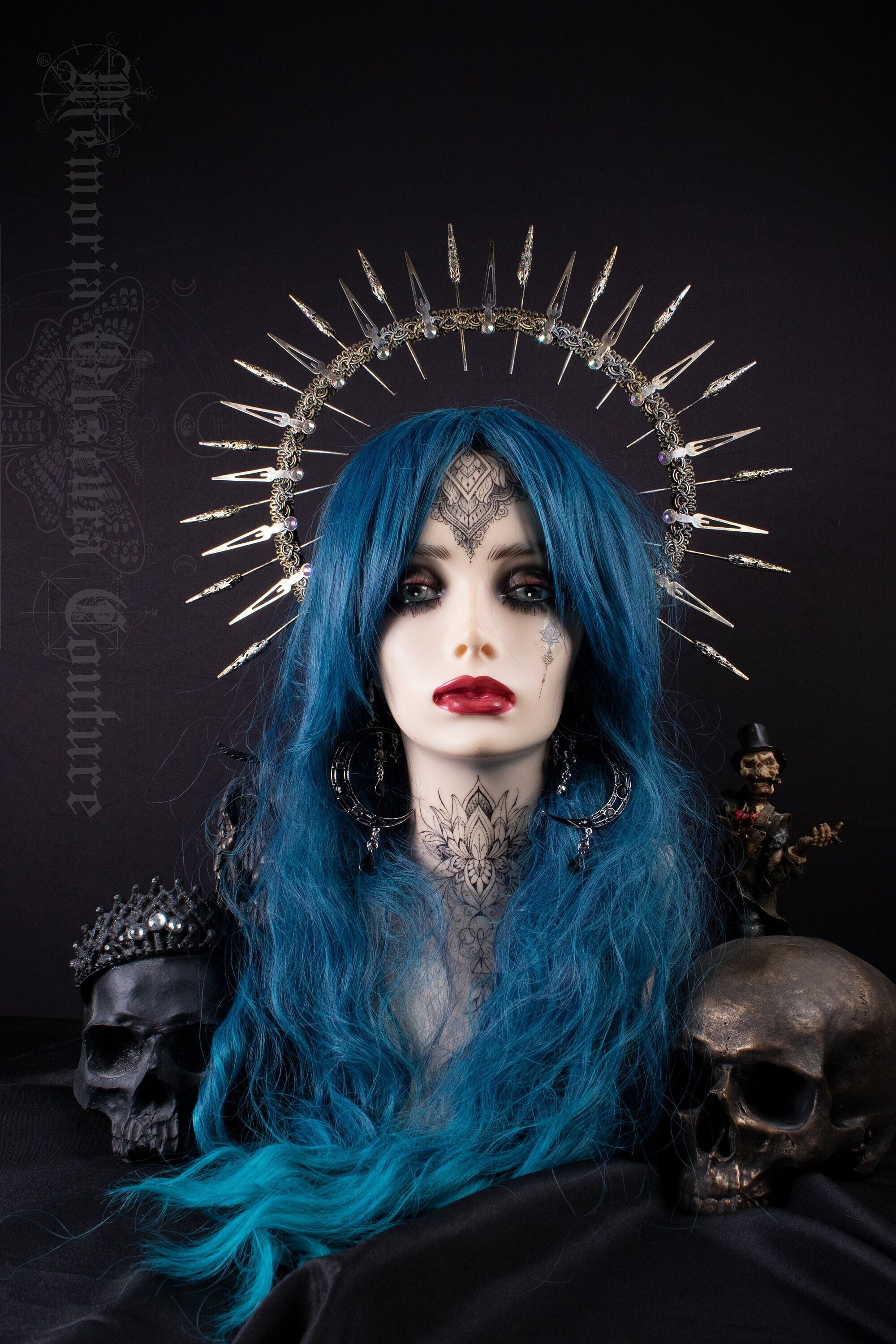 Sunburst halo headdress decorated with aluminum filigree metal ornaments.