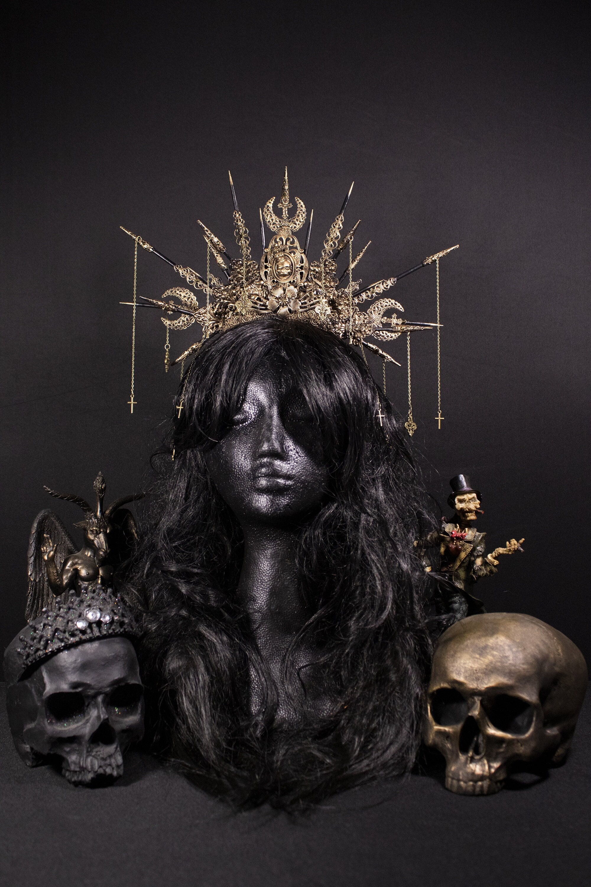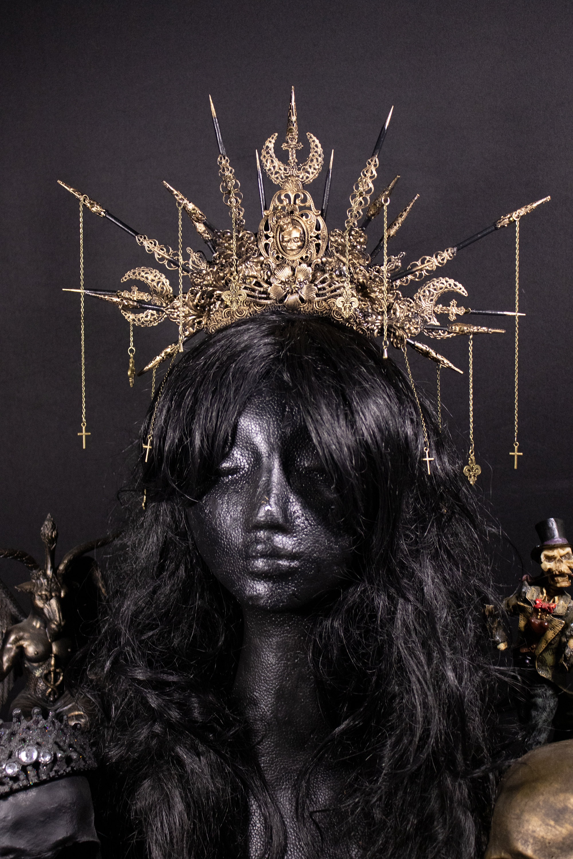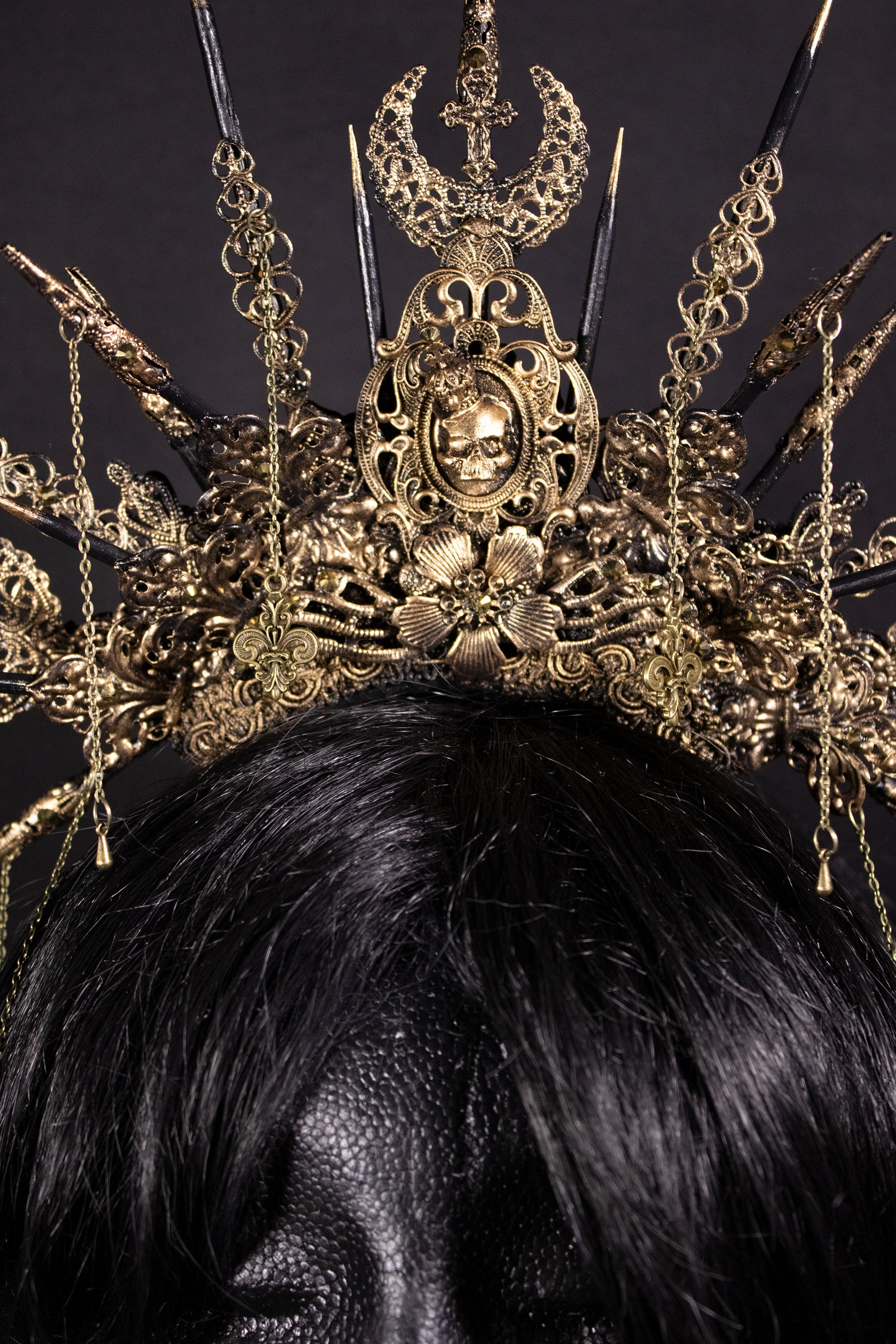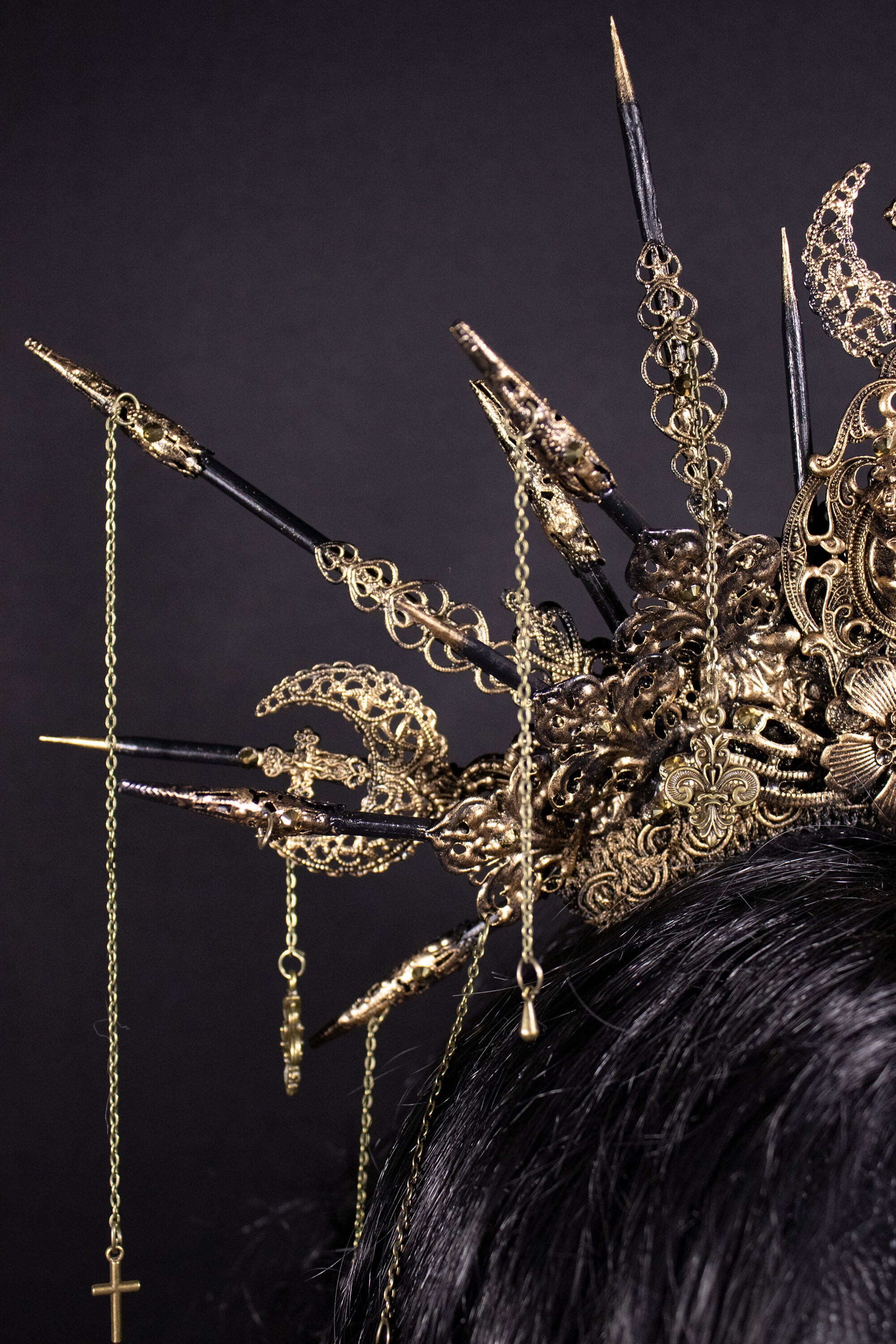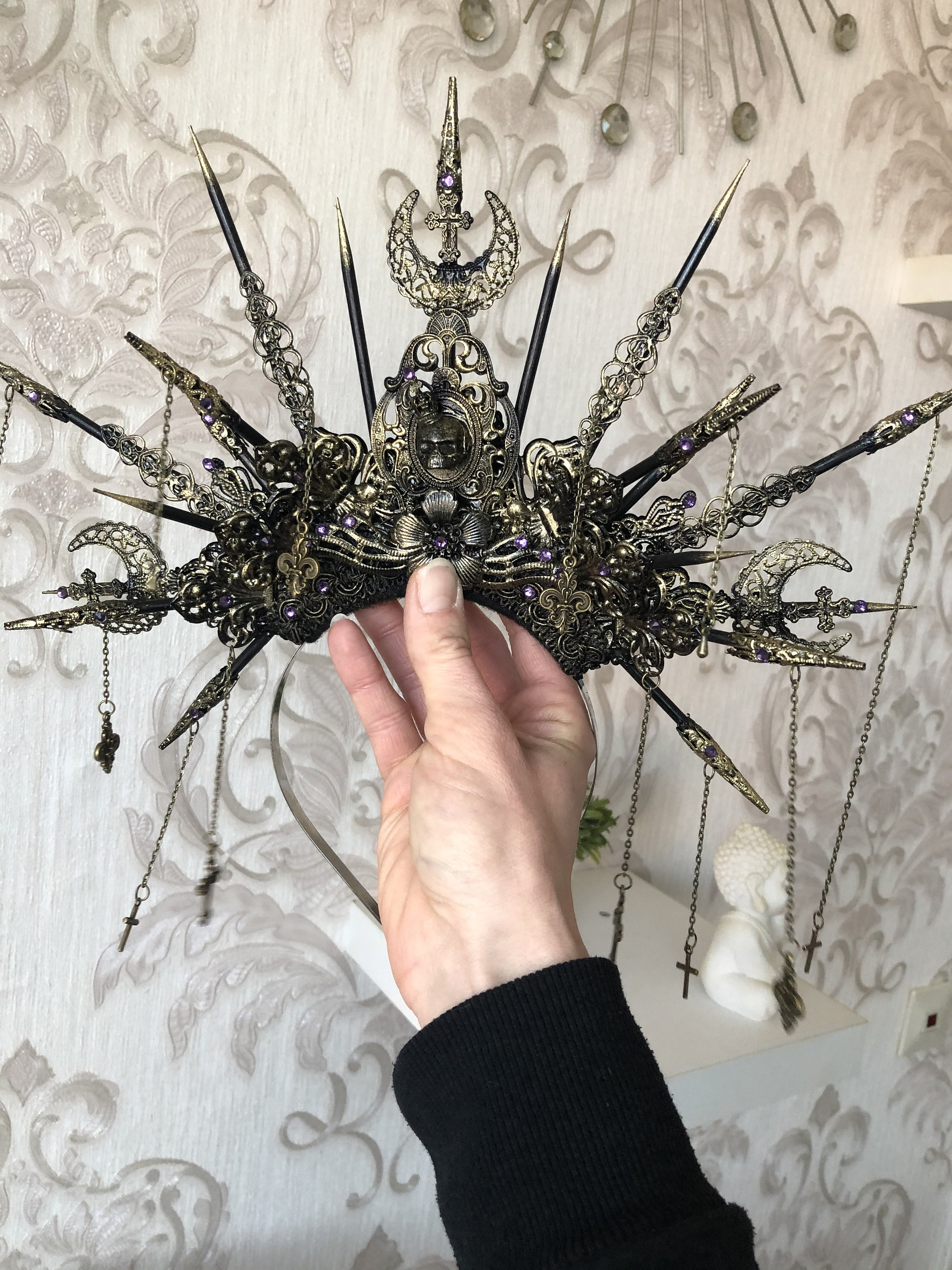 Color in photos: Antique bronze with golden gems.