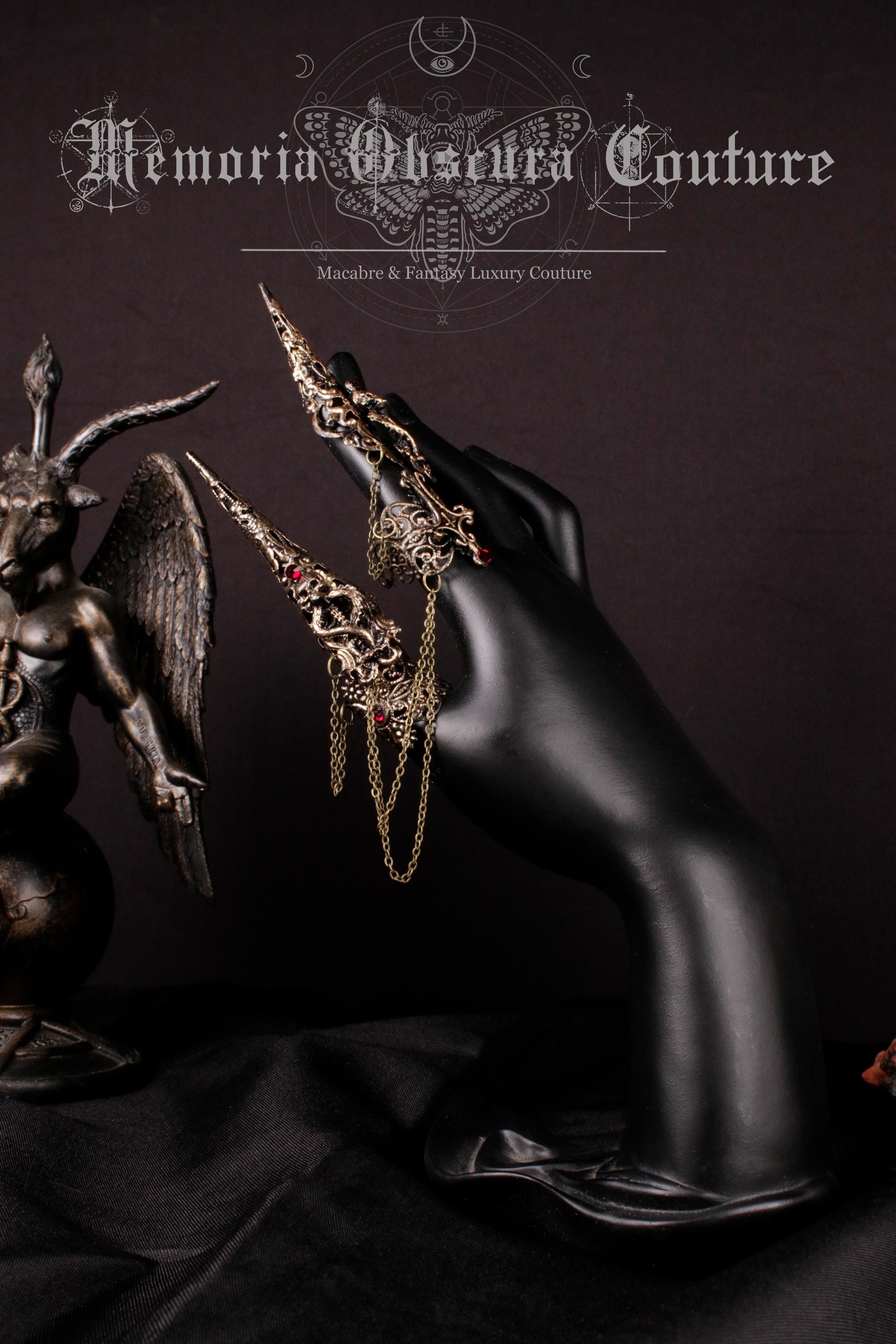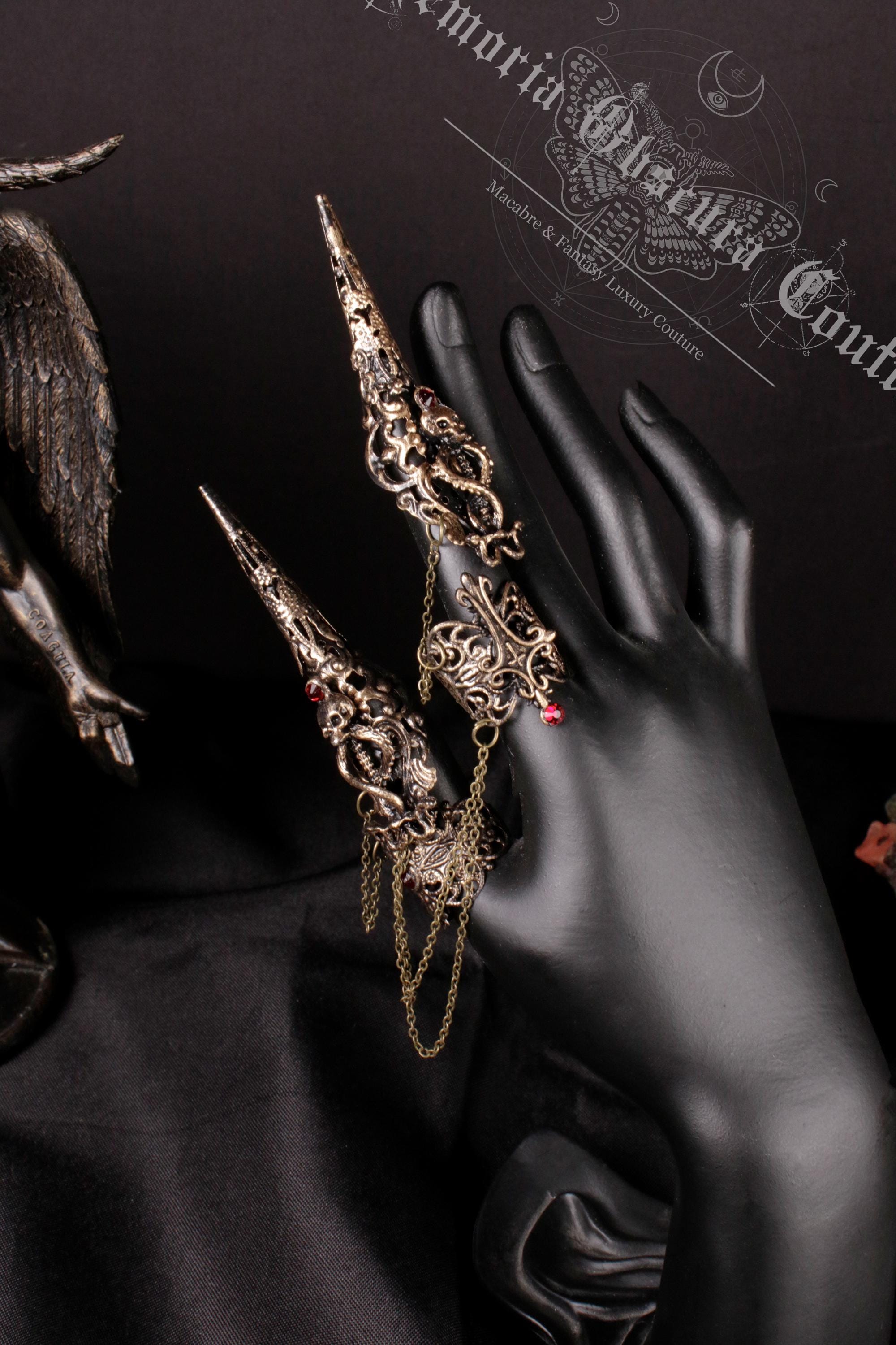 Metal finger claws and rings made of aluminum, decorated with small skeletons around which snakes stretch and cross.