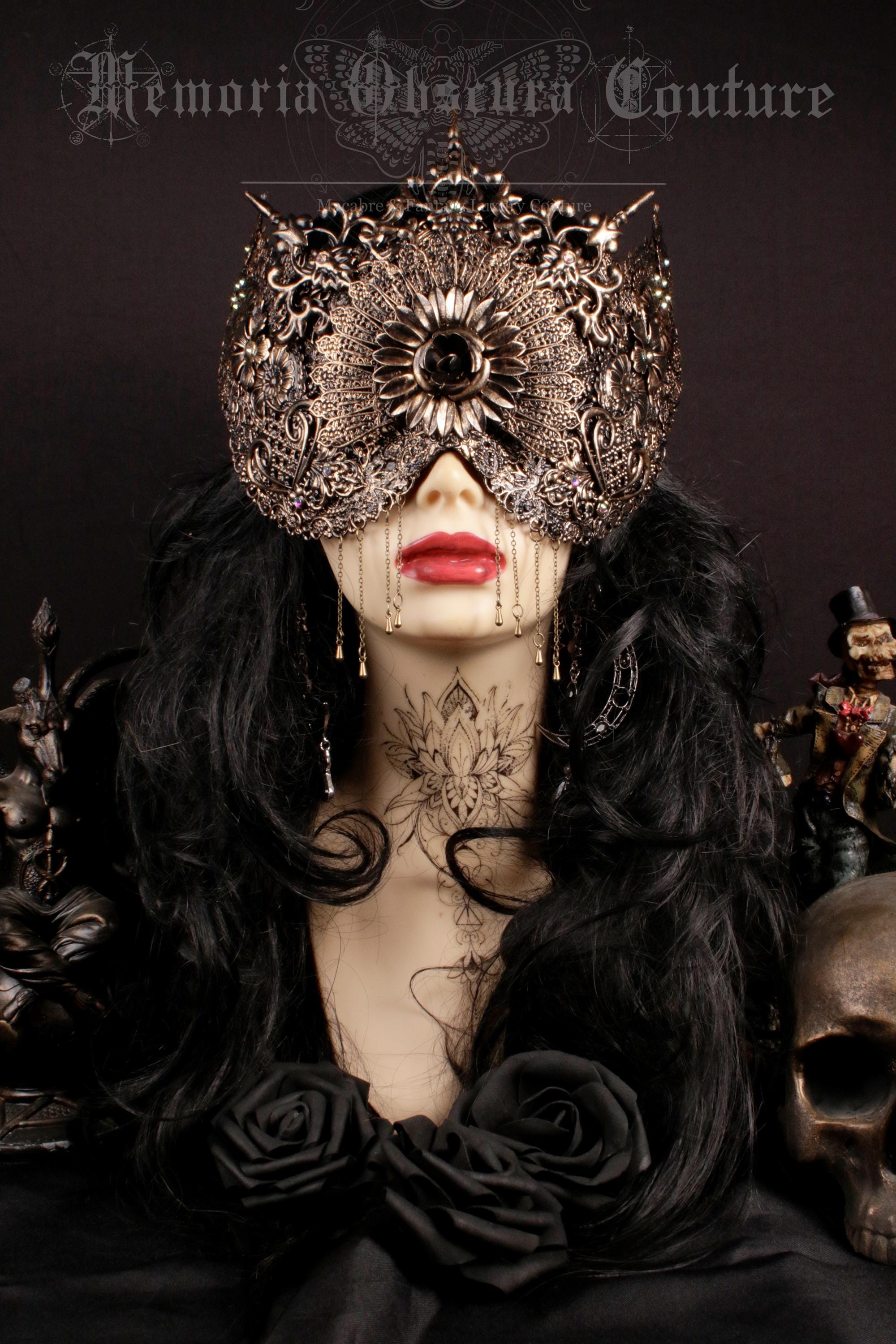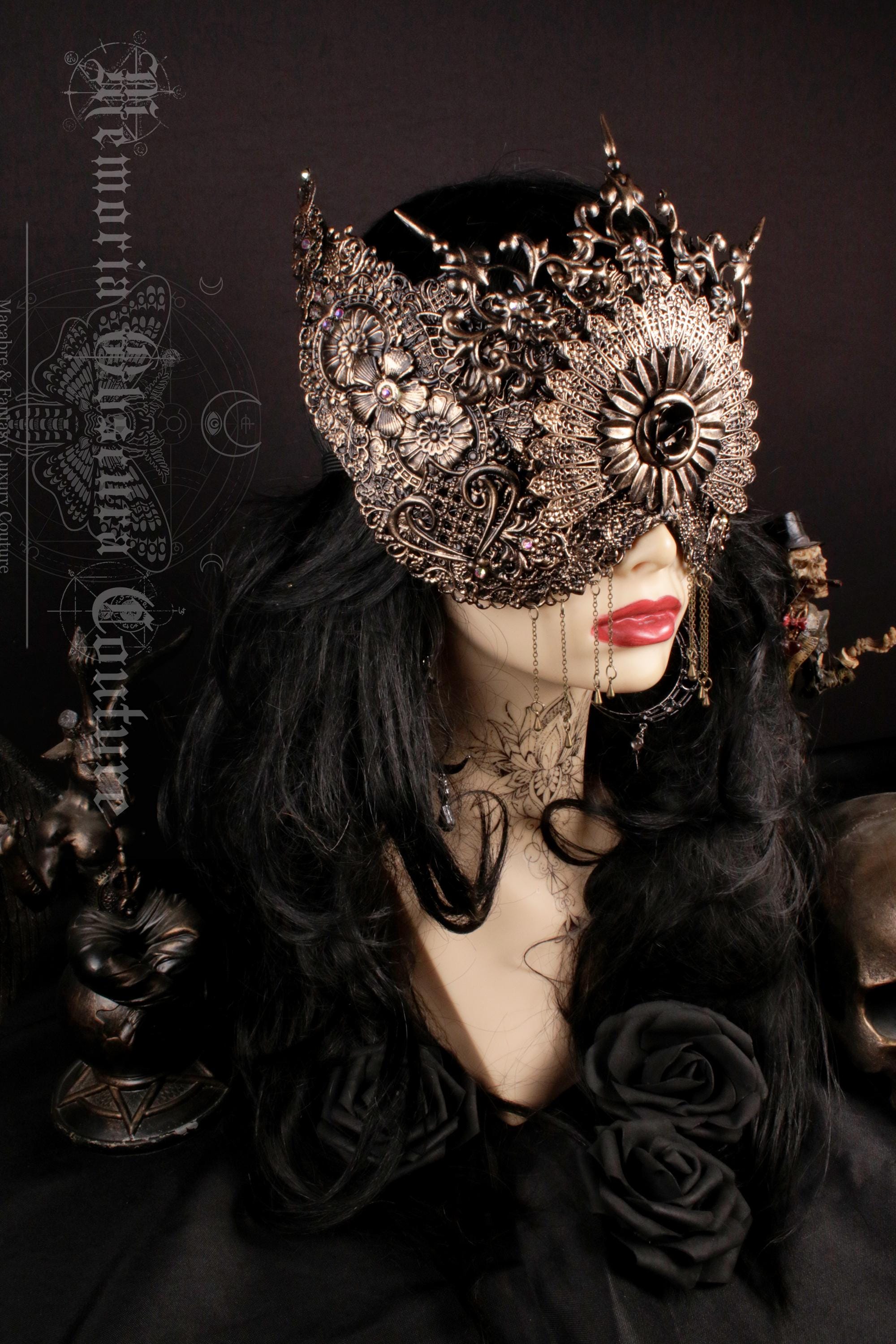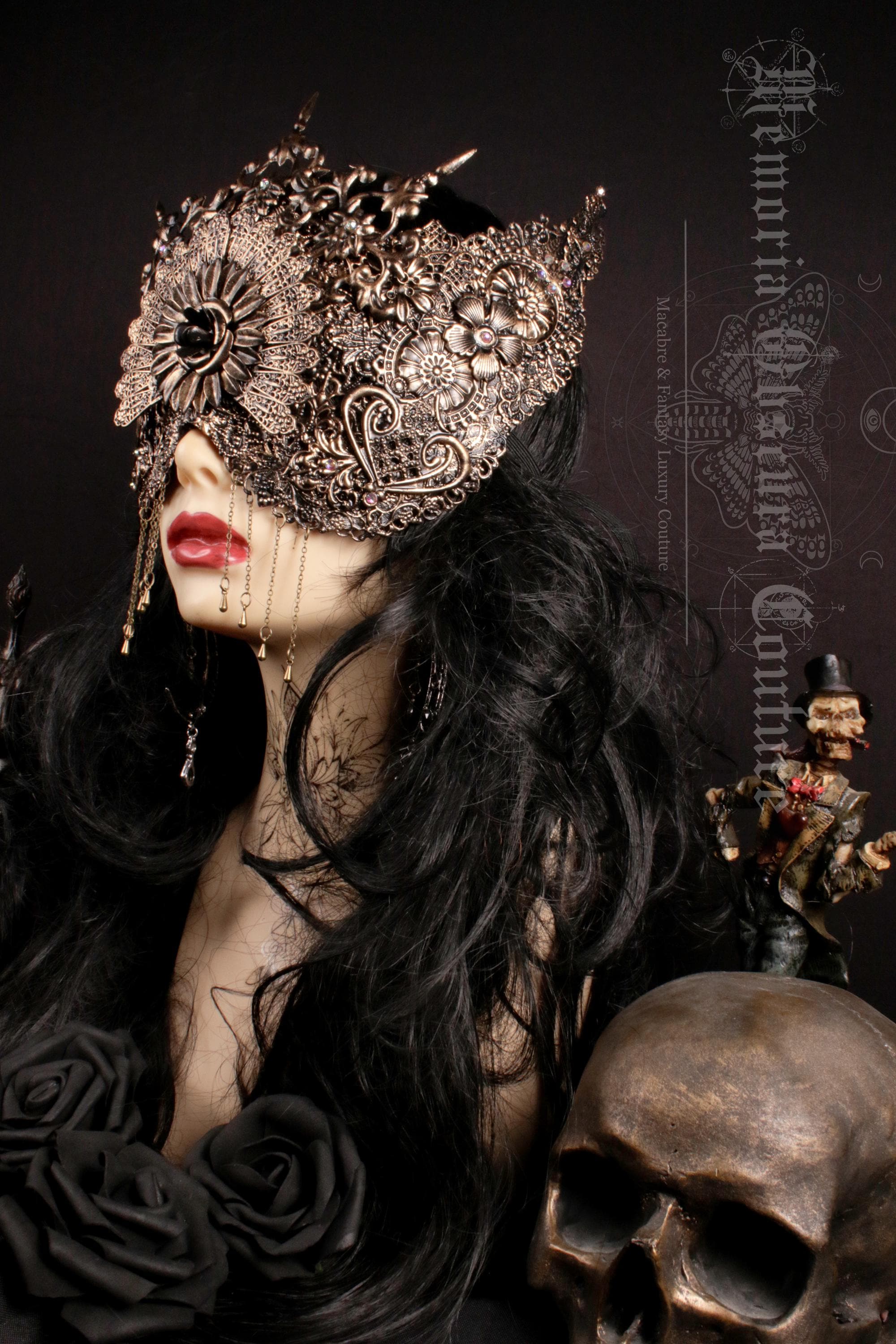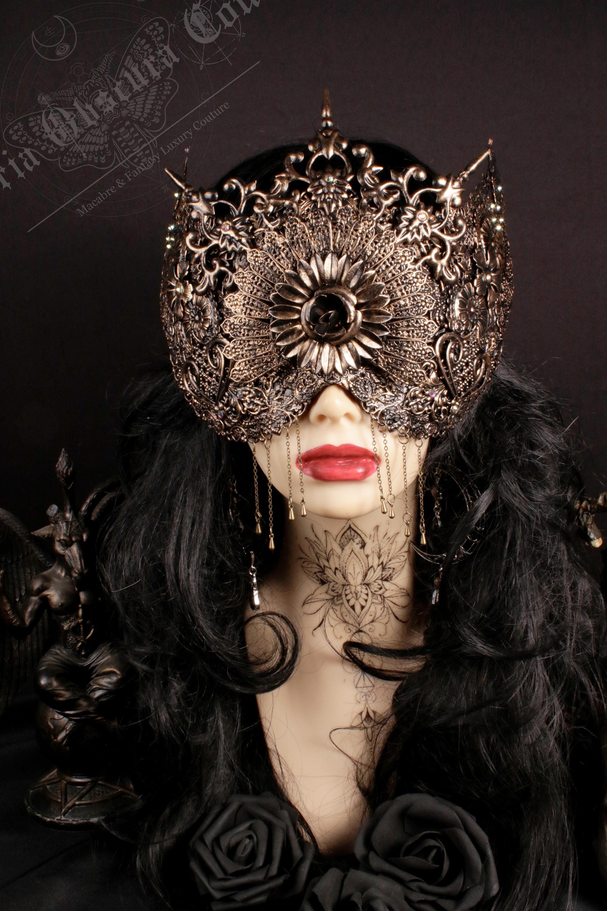 Blind mask decorated with fine filigree metal ornaments and chains.
