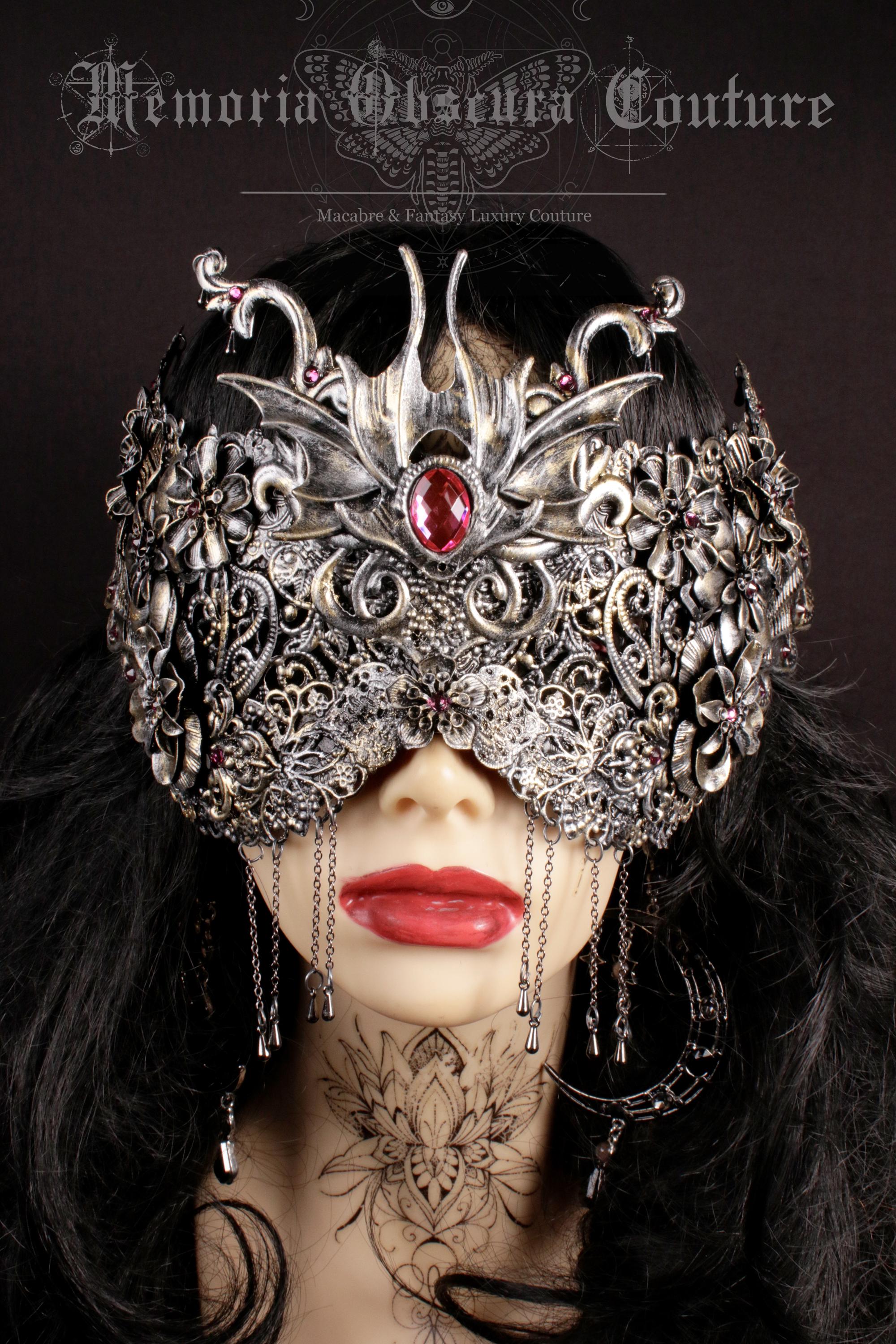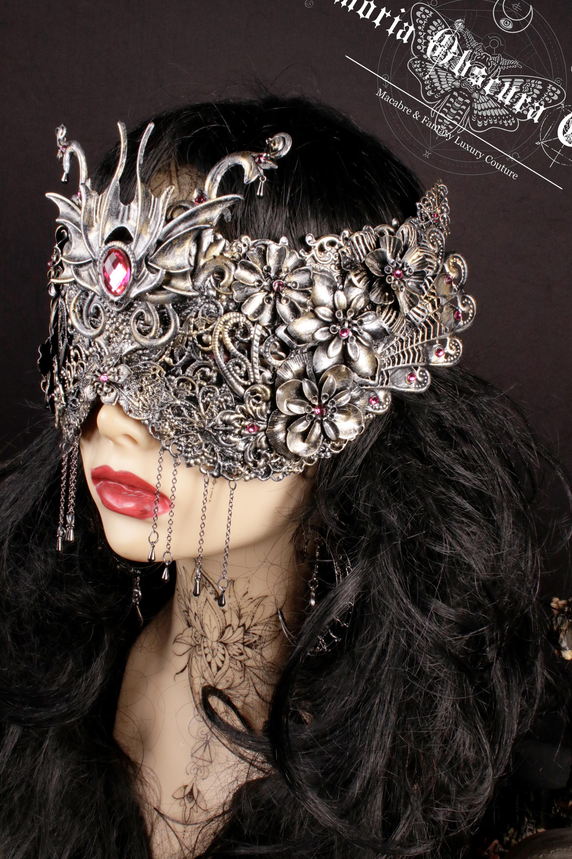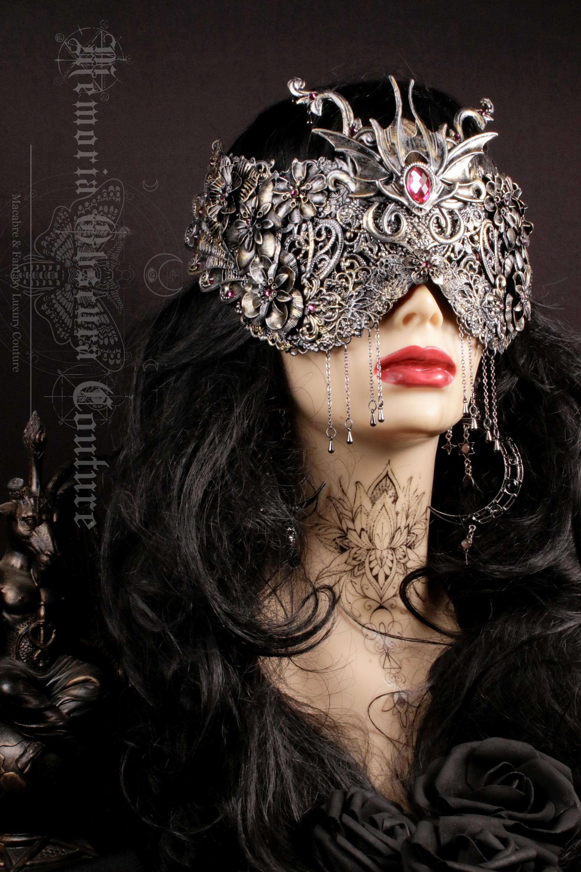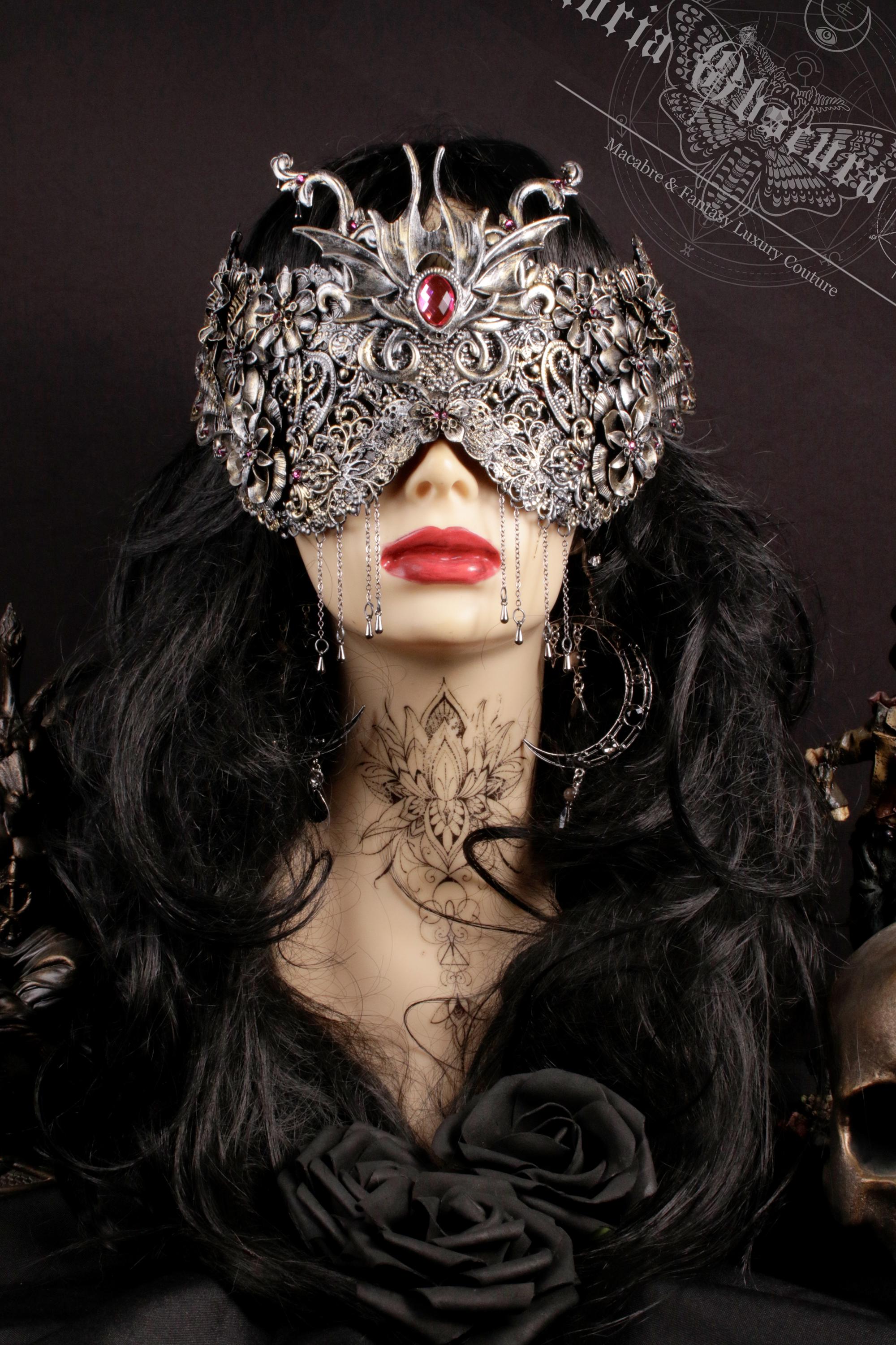 Blind mask decorated with fine filigree metal ornaments and chains.