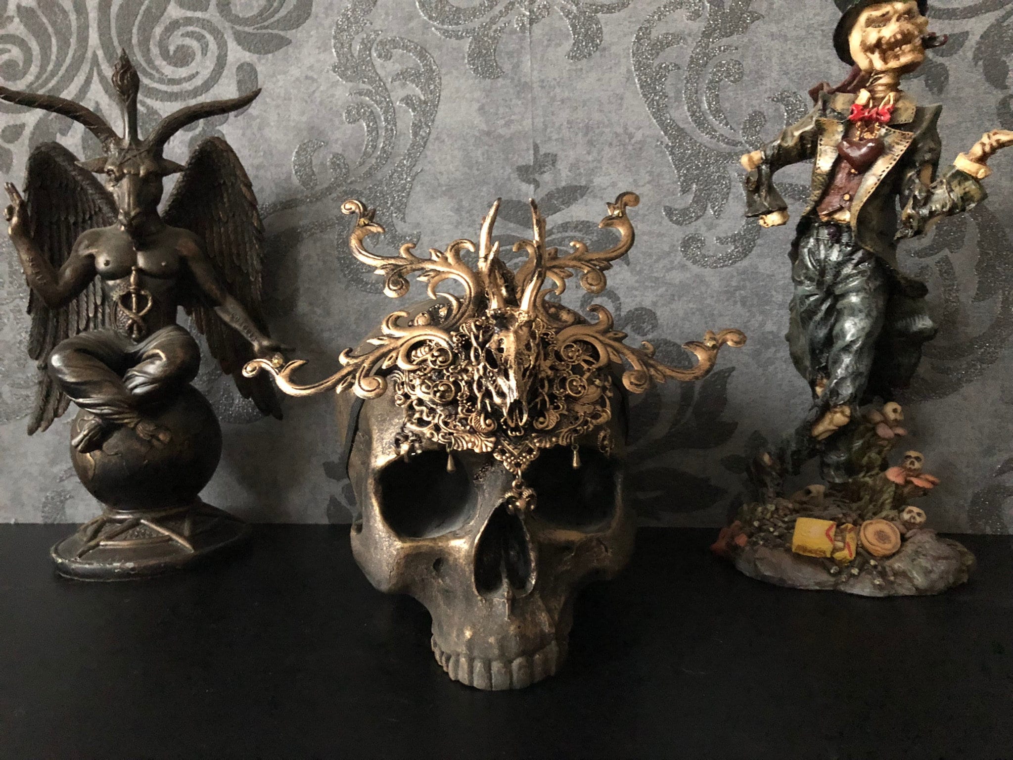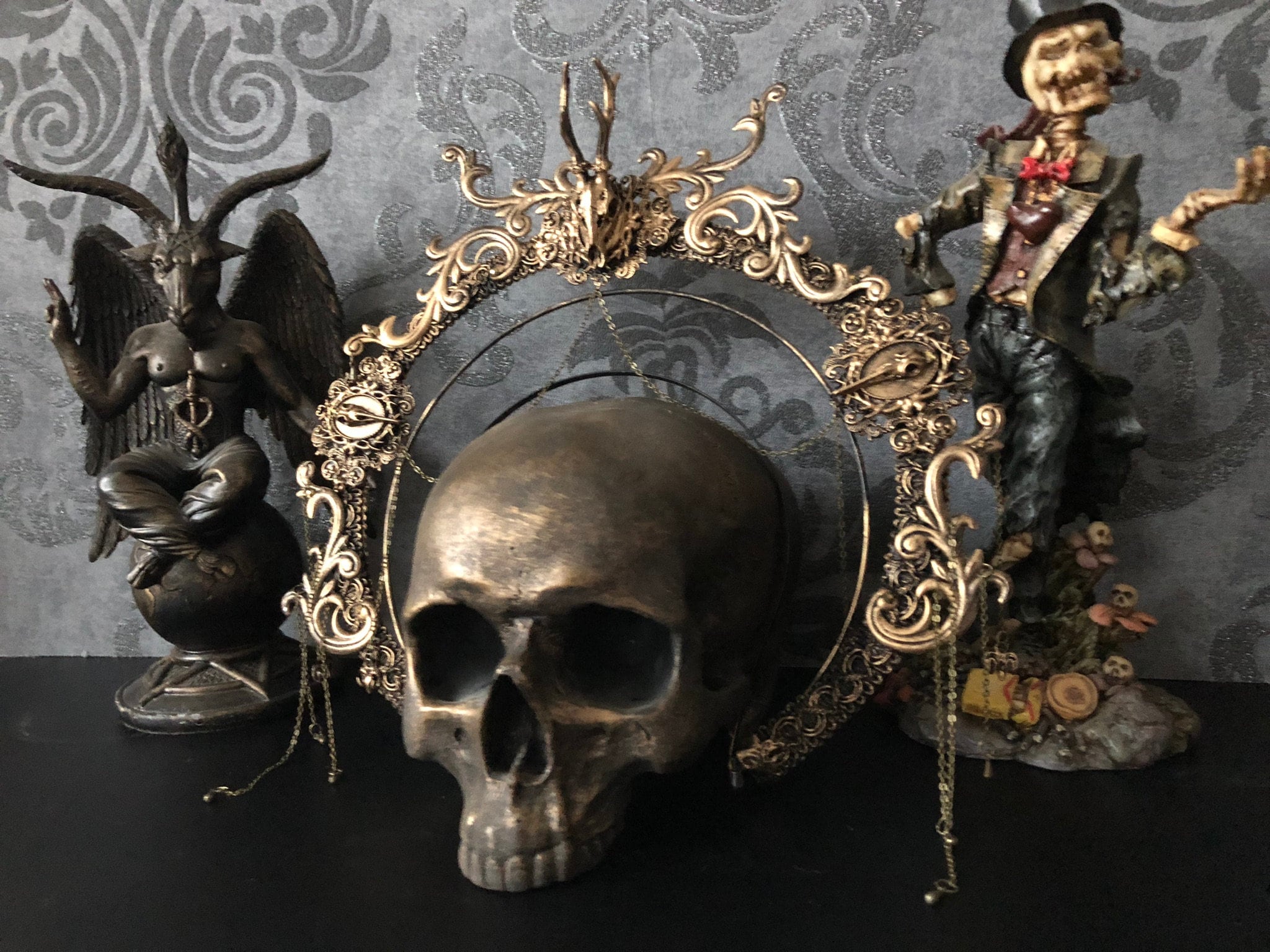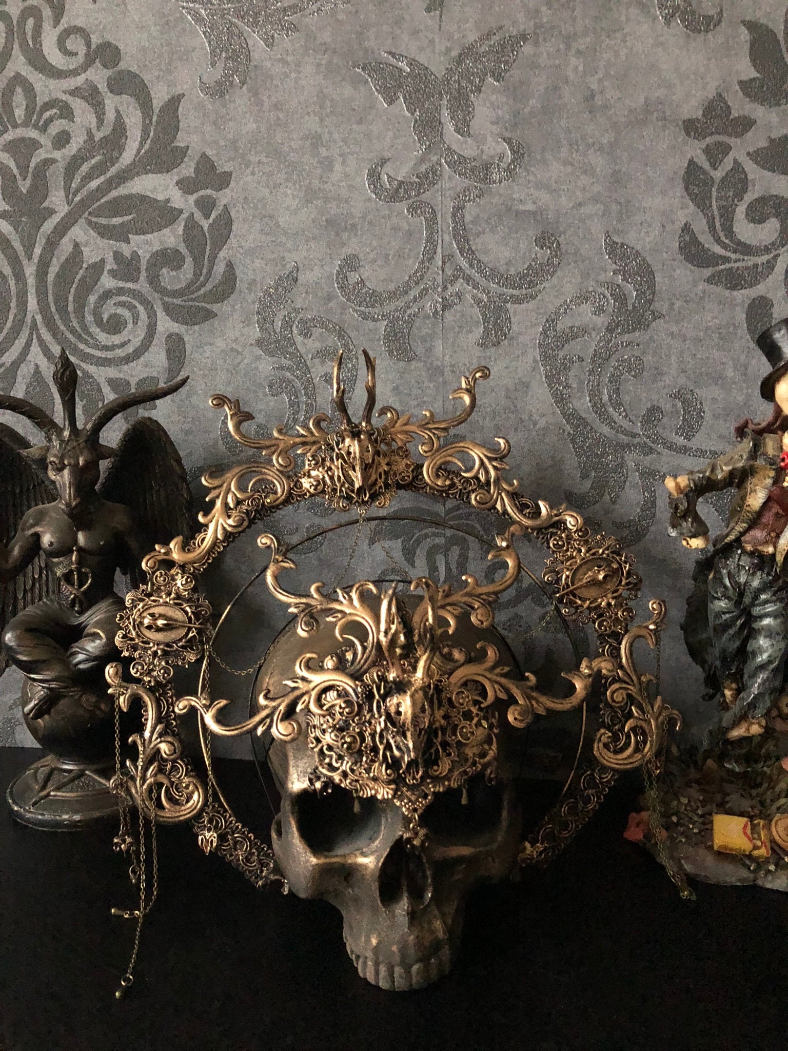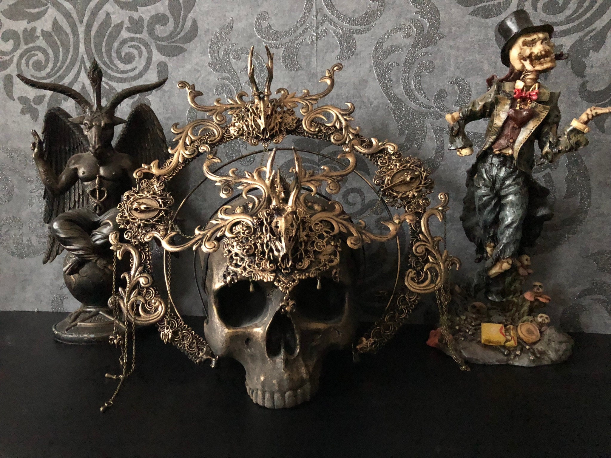 Both items are decorated with lightweight metal ornaments and resin-cast deer skulls.