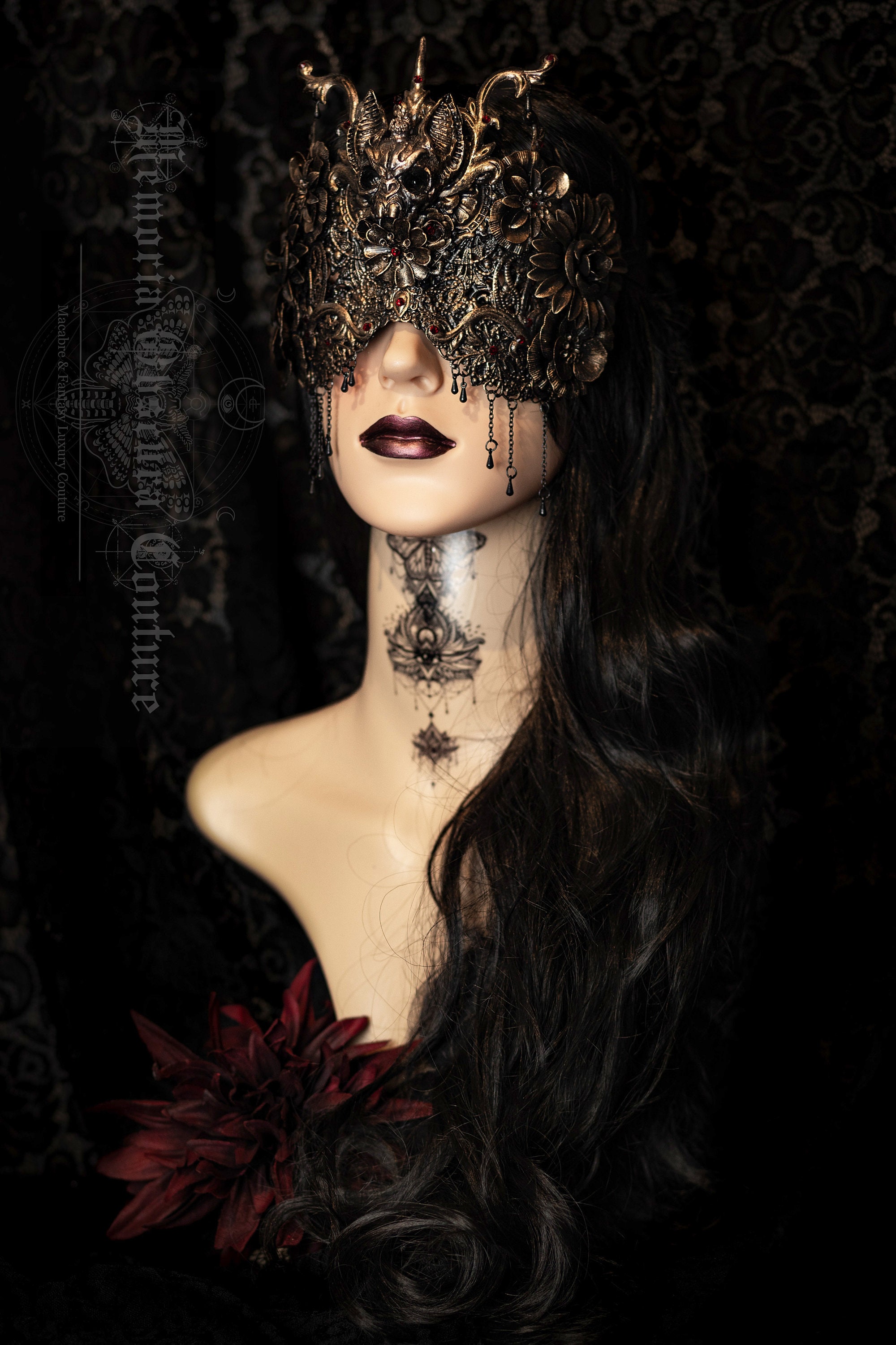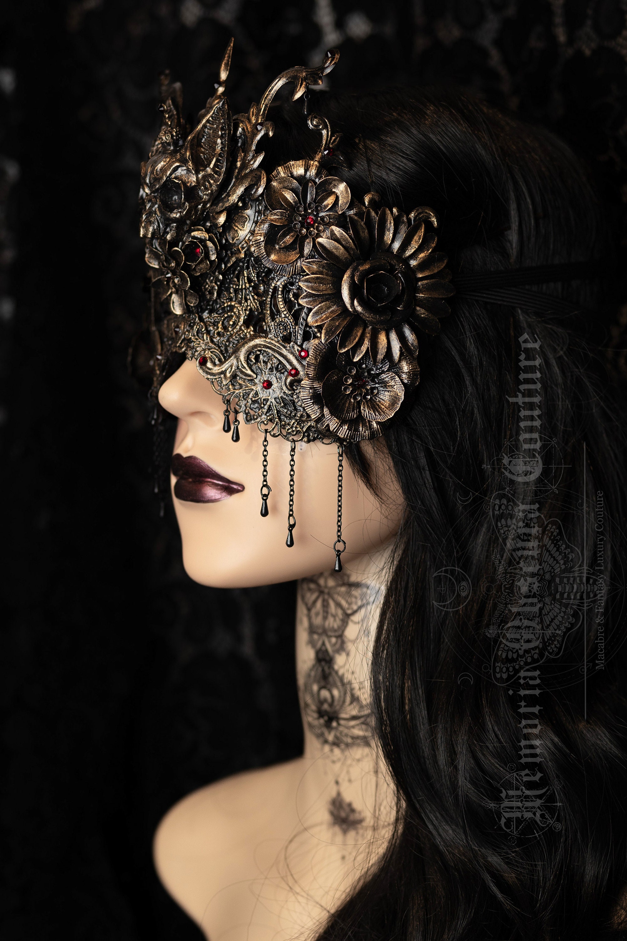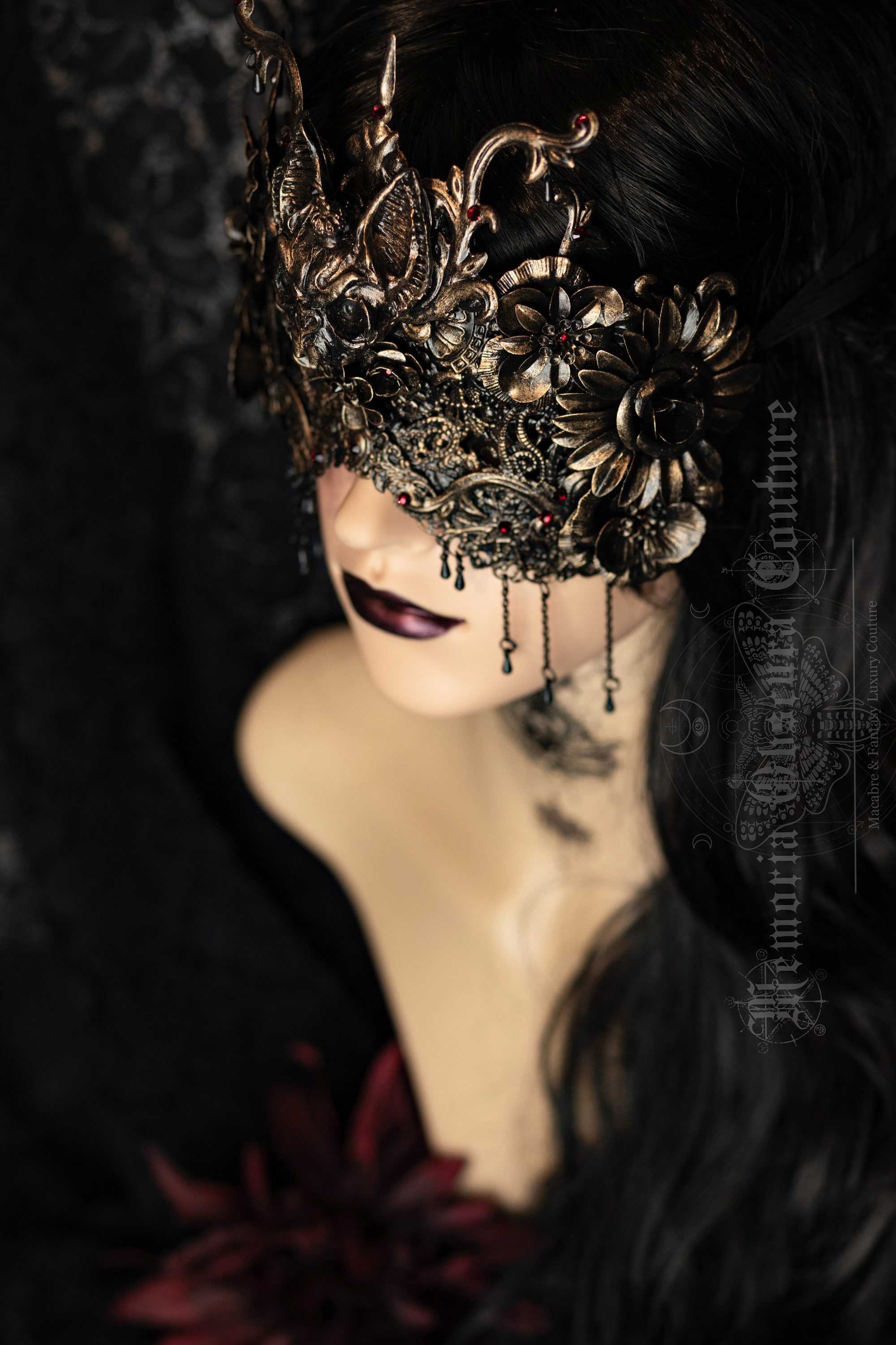 Filigree blind mask decorated with light metal ornaments, flowers and bat skulls.